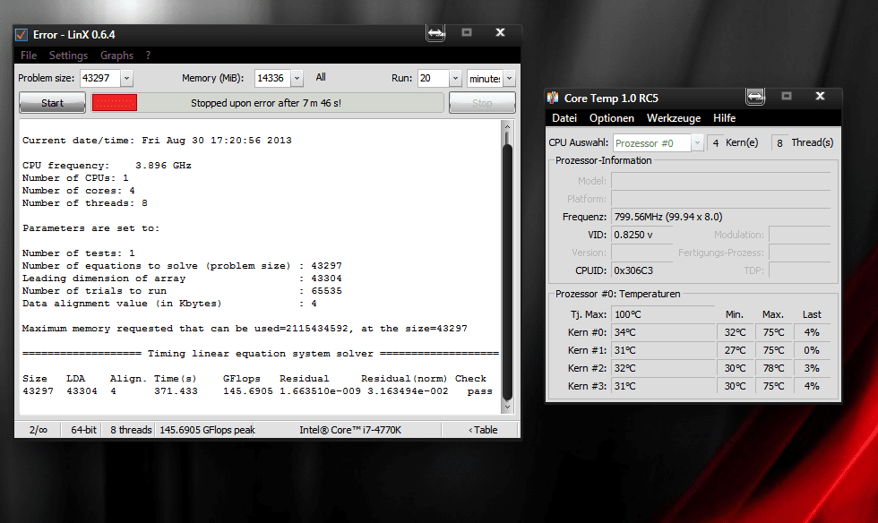 Seltsam, irgendwie bricht es immer nach ca. 7 Minuten ab. Die Max Temp bei einem Kern lag bei 78°C