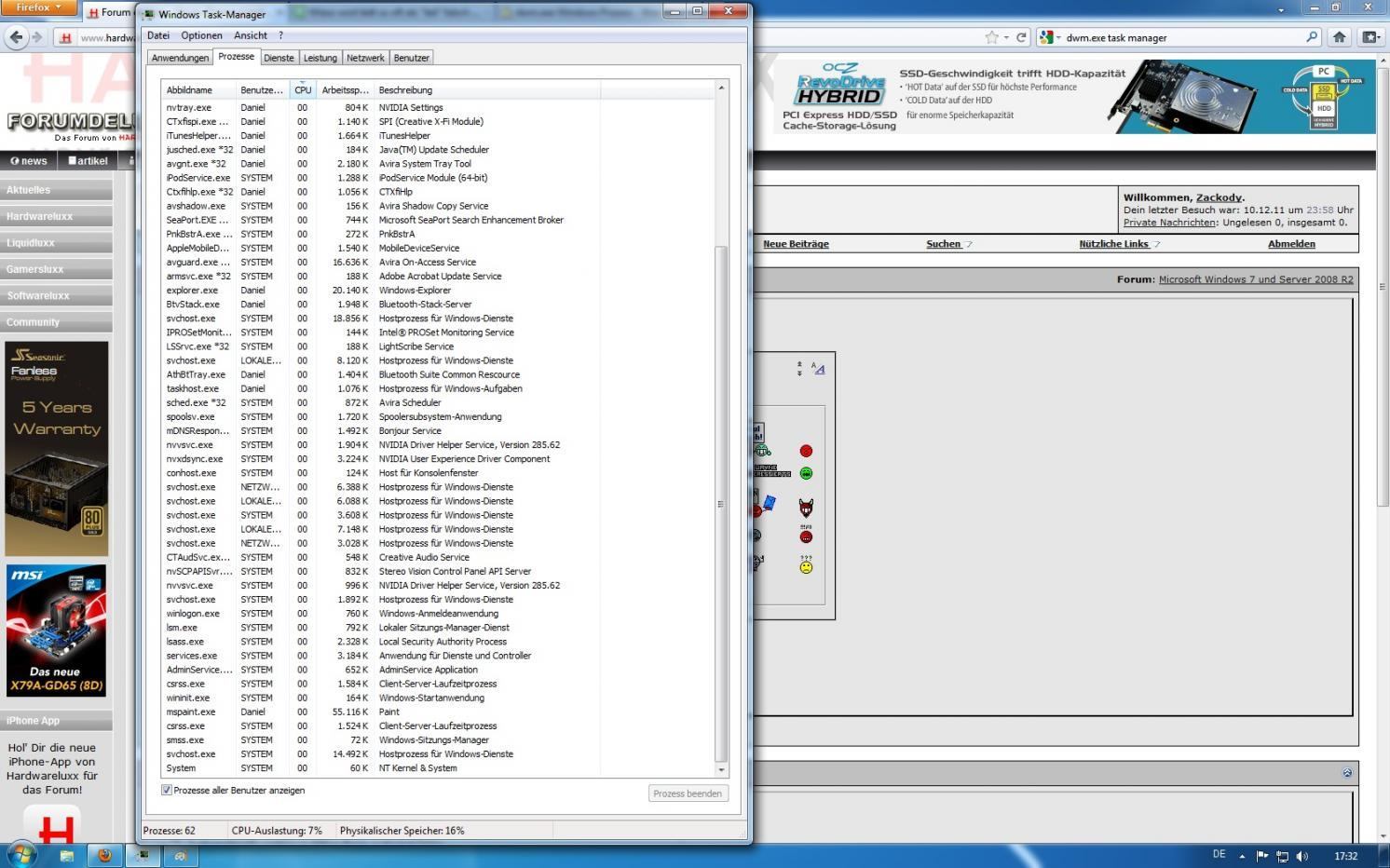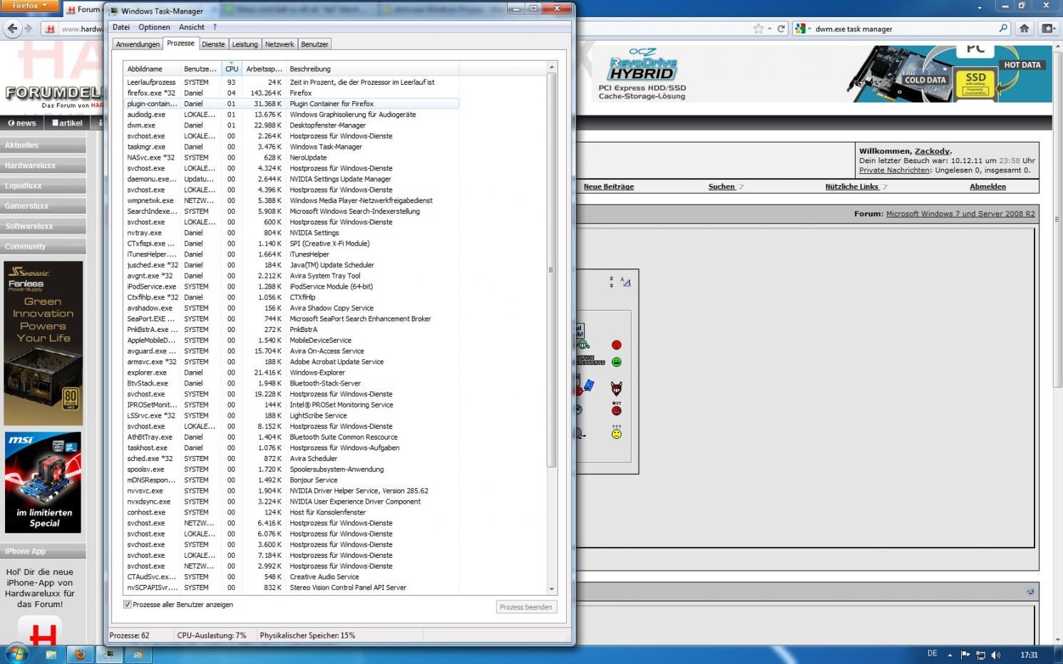 Die Programme öffnen sich teilweise recht langsam (iTunes, Firefox). Hin und wieder stürzt mir Firefox auch mal ab. Manchmal öffnet sich beim Start von Firefox das Fenster und der ganze Bildschirm wird erstmal für ca. 2 Sekunden komplett weiß ehe dann ganz normal wieder die Menüleiste bzw. unten die Windowsleiste erscheint. Auch itunes lädt, obwohl ich noch keine Musik auf meinen Rechner geladen hab, recht langsam (übrigens: unter dem Windows Basisdesign erscheint das Fenster sofort, die Maus wird aber anschließend zum Ladekreis; wenn Aero aktiviert ist dauert es bis das Fenster erscheint, man sieht nur schon irgendwie die Kontur des Fensters auf dem Desktop, dafür muss er aber dann auch nichts mehr laden, wenn das Fenster dann da ist). Hab erst gedacht, es liegt vllt an der HDD, aber wenn ich itunes auf der SSD installiere, dauerts genau so lange.
