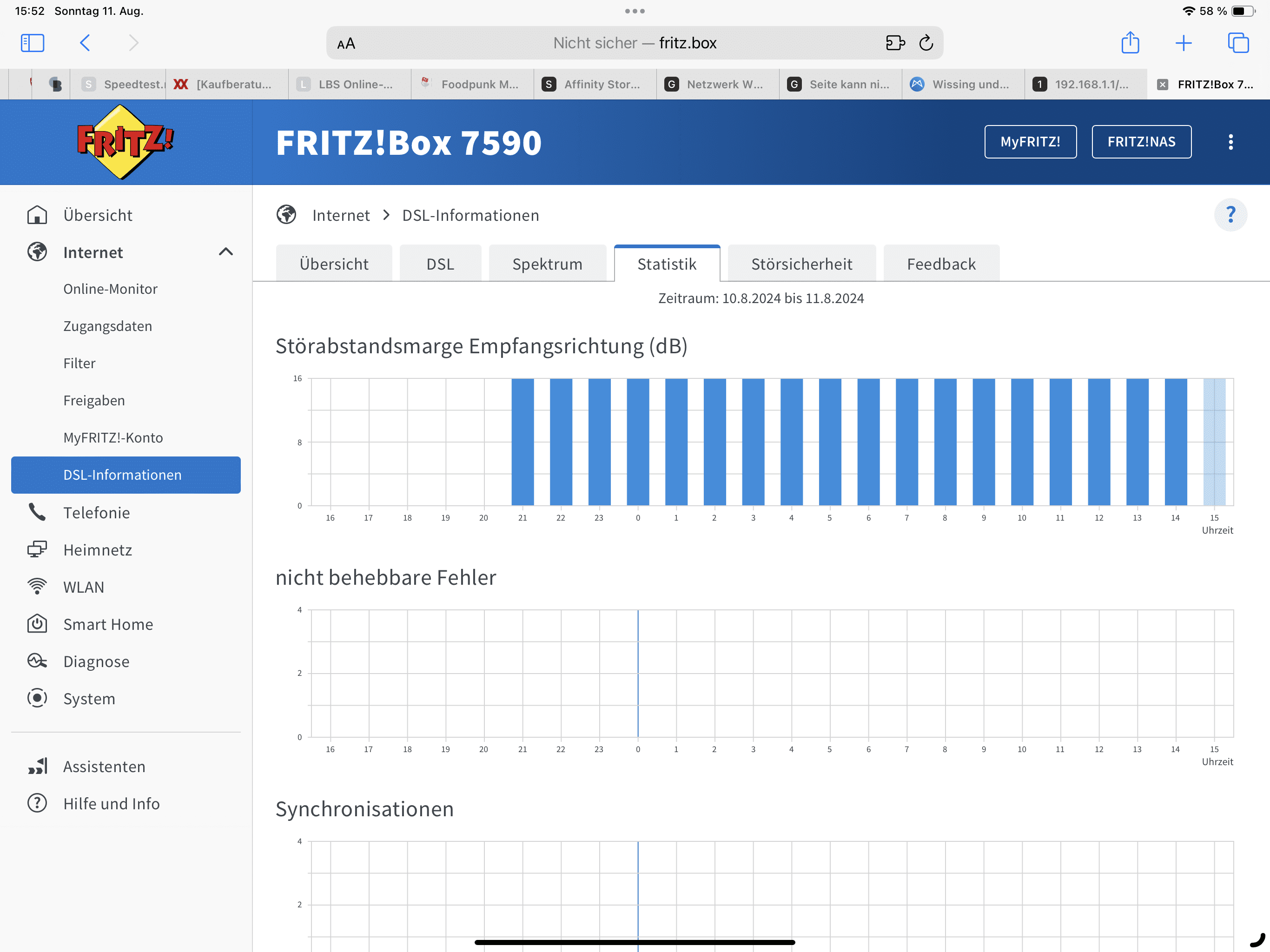 Hat jahrelang ganz gut funktioniert. Seit ein paar Wochen mehren sich aber die Verbindungsabbrüche. Ich hatte erst die Internetverbindung im Verdacht, aber nachdem sonst niemand im Haus Probleme hat, muss es was internes sein. Ich hatte während einer dieser Abbrüche mal versucht auf die FRITZ!Box direkt zuzugreifen. War nicht möglich. Heute kollabierte bei einem dieser Ausfälle auch das WLAN, schön zu sehen gewesen am Handy, wo dann statt dem WLAN Symbol ein fröhliches E(dge) grüßte