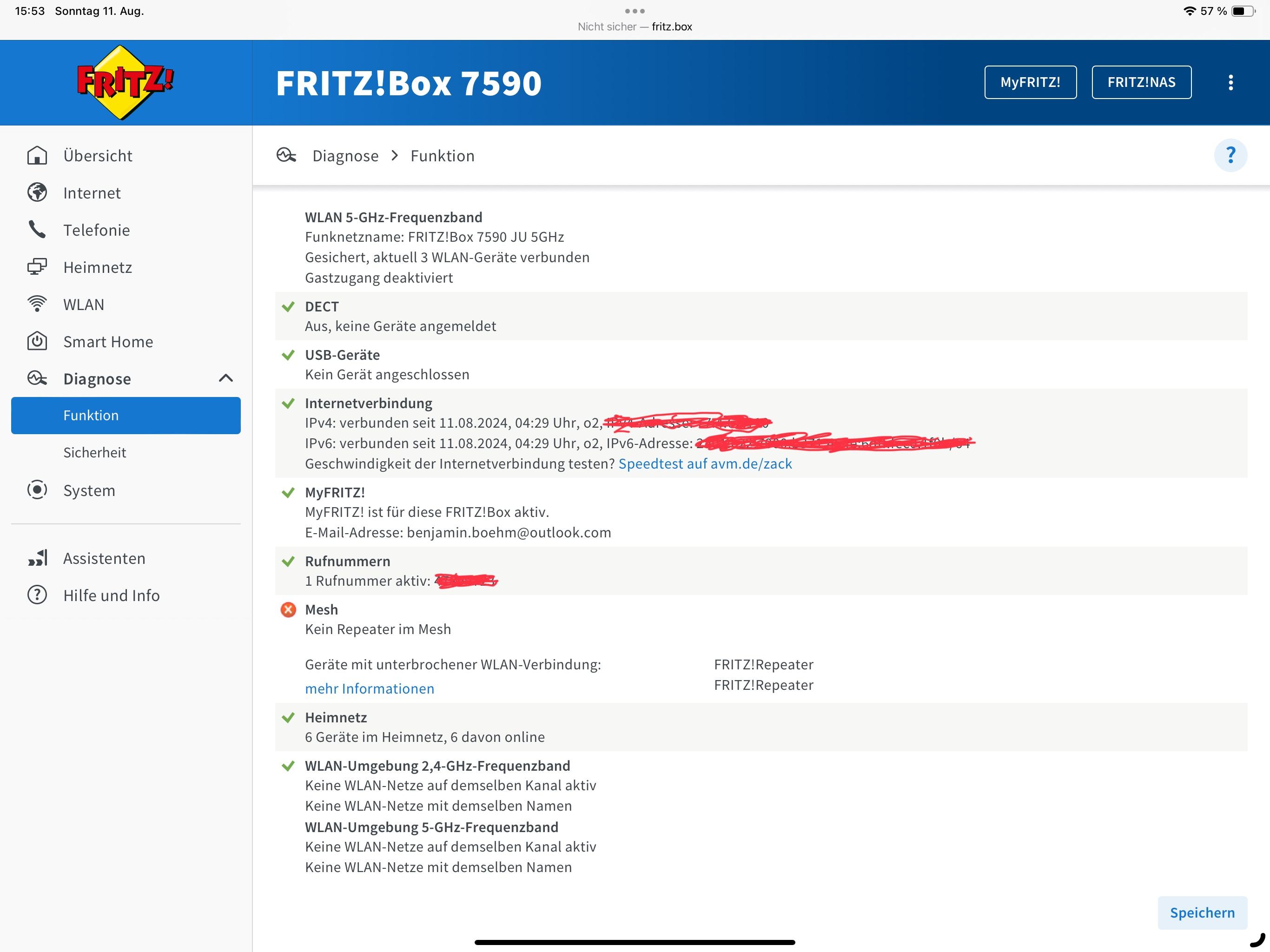 Aktuell habe ich eine FRITZ!Box 7590 mit zwei FRITZ!Box 3000 Repeatern im Mesh.