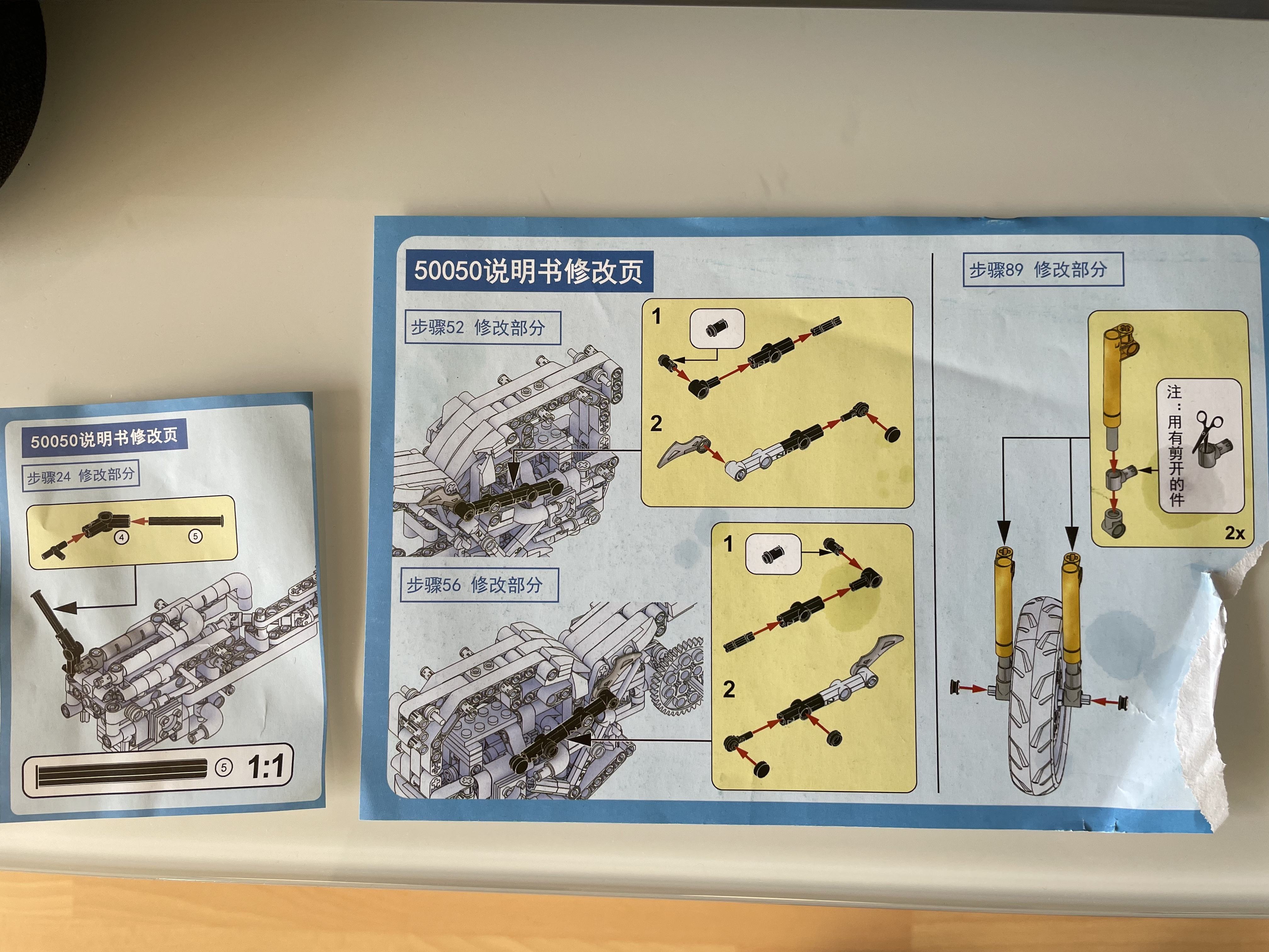 Wie versprochen noch Fotos von dem China Set, handelt sich um eine BMW R nineT von “Bulokeliner” für 26,99. Für das Geld kann man damit eigentlich echt nix falsch machen, ist halt ein klassisches Vitrinenset. Der Kurze war damit auch nicht so wirklich begeistert. Etwas seltsam fand ich bei der Anleitung das zwei Seiten extra dabei waren, eine davon war leider mit dem Umriss des Sticker-Aufklebers verklebt. Die Kardanwelle zum Hinterrad musste ich gegen ne 4er oder 5er Stange austauschen, die beiliegende war zu kurz. Aber das hab ich ja eh da, von dem her kein Problem. Die Zylinder werden nur an einer Seite fest gemacht, lassen sich also auch oben nehmen und leicht nach unten klappen. Dann läuft der Motor allerdings so unrund, das man den Hinterreifen eigentlich nicht mehr bewegen kann. Die Federgabel war bei mir schon montiert, da musste ich nichts so seltsam einschneiden wie in der Anleitung.