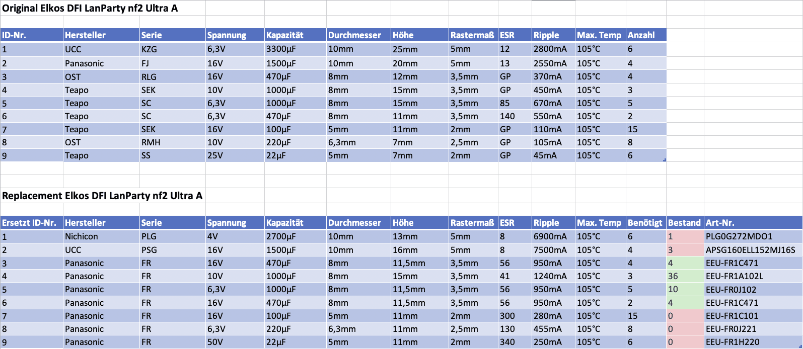 Es kann sein, dass bei dir im Original andere Hersteller verbaut sind, aber die Elkoklassen werden die gleichen sein. Also statt UCC KZG könnten da z.B. Nichicon HM oder Rubycon MBZ sitzen usw.., ändert aber nichts an den benötigten Replacements aus der zweiten Tabelle.