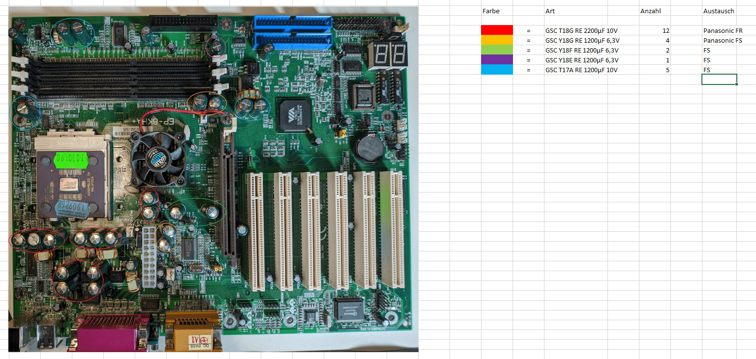 5. Die Kapazität sollte auch grob passen, wobei ich bei +-20% bisher keine Probleme hatte. Sprich einen 1800uF Cap kann man meist locker mit 1500uF bis 2200uF ersetzen ohne das groß was passiert.