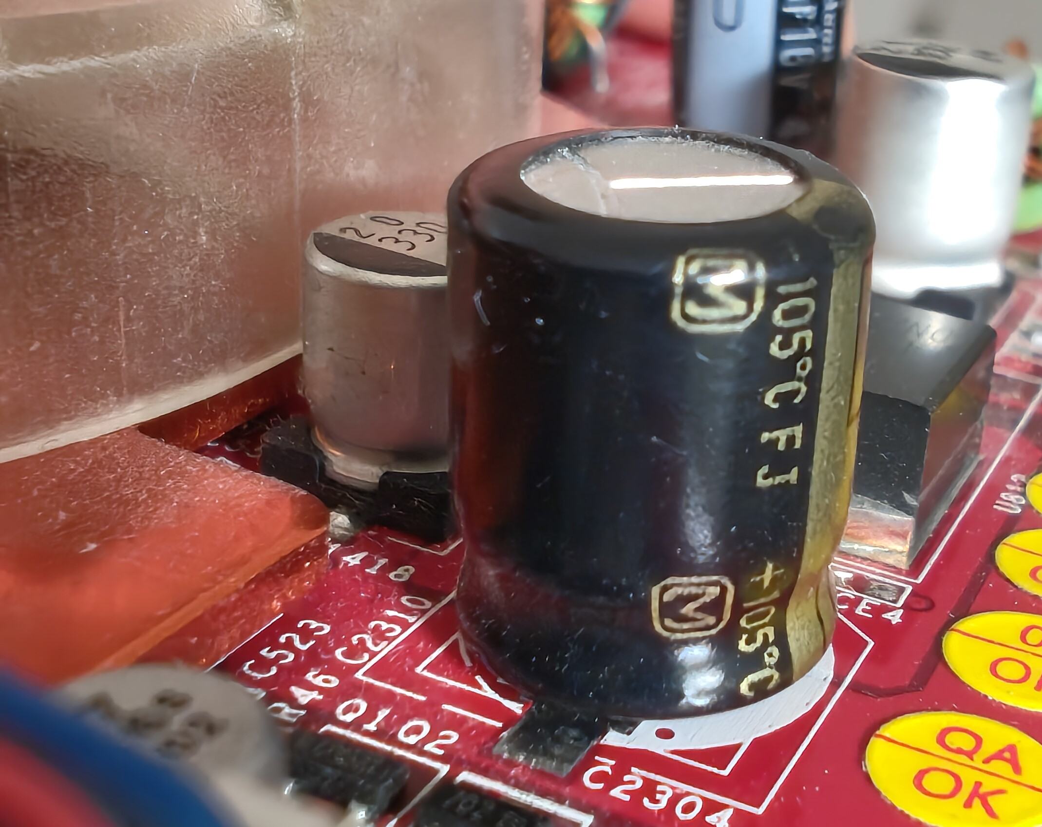 Heute war das Ziel, die Graka ohne den Chip zu testen. Dafür mussten zwei Elkos auf dem Board getauscht werden, die hinter dem AGP Slot sitzen und zu hoch waren (sieht man oben). Paar kleine Baustellen auf der Graka beseitigt und sonst ist zum Glück nichts kaputtgegangen. Bild ist wie erwartet.