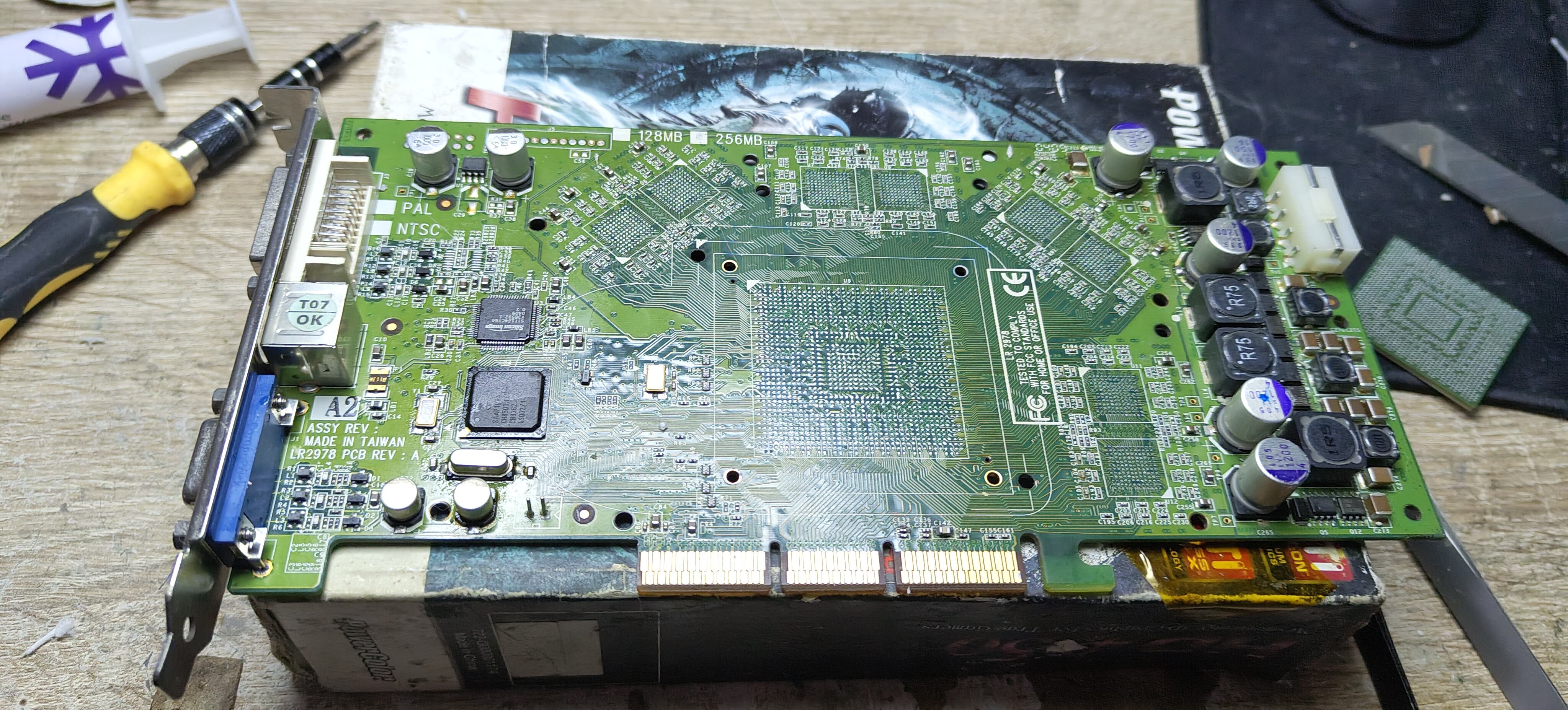 Kurzschluss auf dem Speicher behoben (8 Chips reballed), neue GPU eingelötet, Speicher wieder eingelötet.
