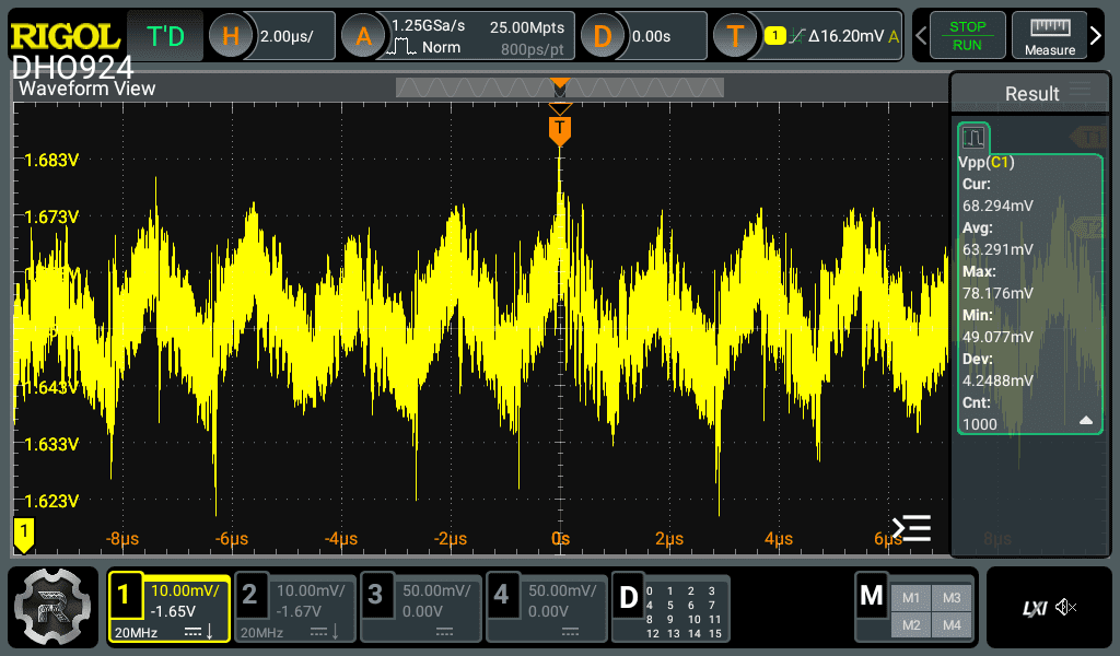 Das ist kein Signal mehr, das ist einfach nur noch Müll :d Wohlgemerkt ist das in diesem Beispiel sogar noch relativ "verhalten" wenn man so will. Das geht, je nach Board und äußerer EMV Einflüsse an der jeweiligen Messposition noch viel viel schlimmer, sodass wir da mehrere 100mV an Störungen reinbekommen können.