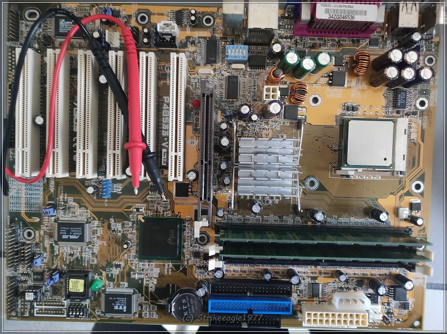 Will sagen "optisch zuordnen" ist immer schön und gut und in den meisten Fällen auch offensichtlich, aber wenn man sich dennoch mal unsicher ist, einfach mal das Multi dran halten und schauen, was hier eigentlich wirklich anliegt, denn es gibt halt auch so Kandidaten, wie z.B. das A7N8X, wo primär- und sekundärseitig das gleiche steht, nämlich in beiden Fällen 3300µF mit 6,3V. Als wir hier noch mit 2,5V oder 4V Caps auf der Sekundärseite gearbeitet haben lag darin natürlich ein erhöhtes Gefahrenpotential, denn obwohl sie alle gleich aussahen, konnte man von den 8x 3300µF 6,3V nur 5 Stück mit 2,5 oder 4V ersetzen, weil die halt die vCore gesehen haben, die anderen drei sehen 5V und das hätte bei denen dann geknallt, hätte man die alle gleich ersetzt.