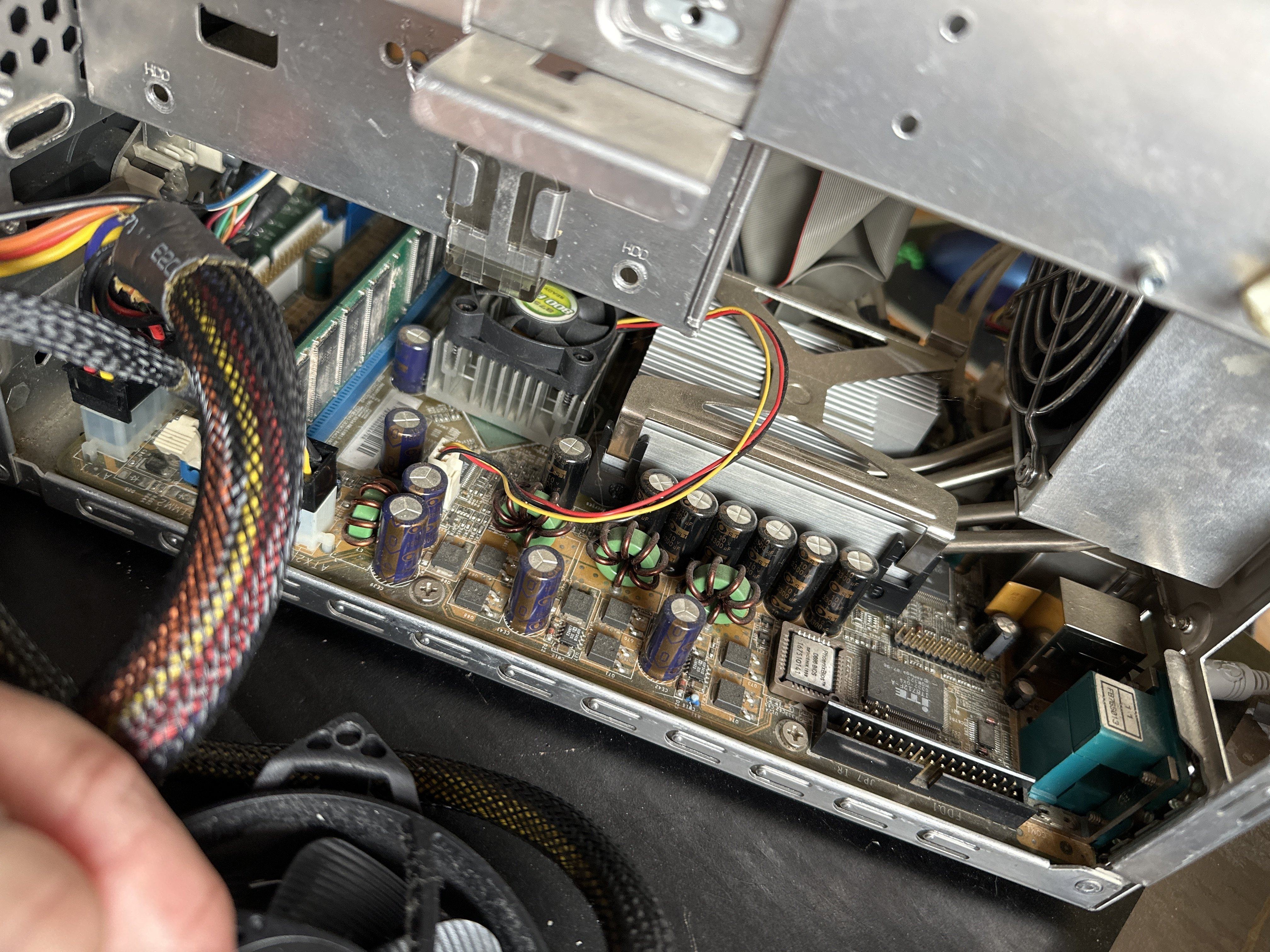 Klassisches recap. Northbridge kühler zalman blau gegen originalen ersetzt. Dem ging es nicht gut. Gereinigt, zusätzliche Geleitscheibe und paar Haare von der Rotorwelle gezupft. Schnurrt wieder. Mosfet Propeller nachgerüstet. Der originale hat leider gefehlt. Im Bild ist er verkehrt herum. Bleibt so. Ließ sich einfacher biegen. Hat de mom jetzt zwei Rouladennadeln weniger? Vllt. Ansonsten muss ich noch zwei Caps tauschen die mir ein Freund noch zukommen lässt. Bis auf 3 polys, sind alle secondhand. Immer Mal wieder von nicht wiederbelebaren recycelt.