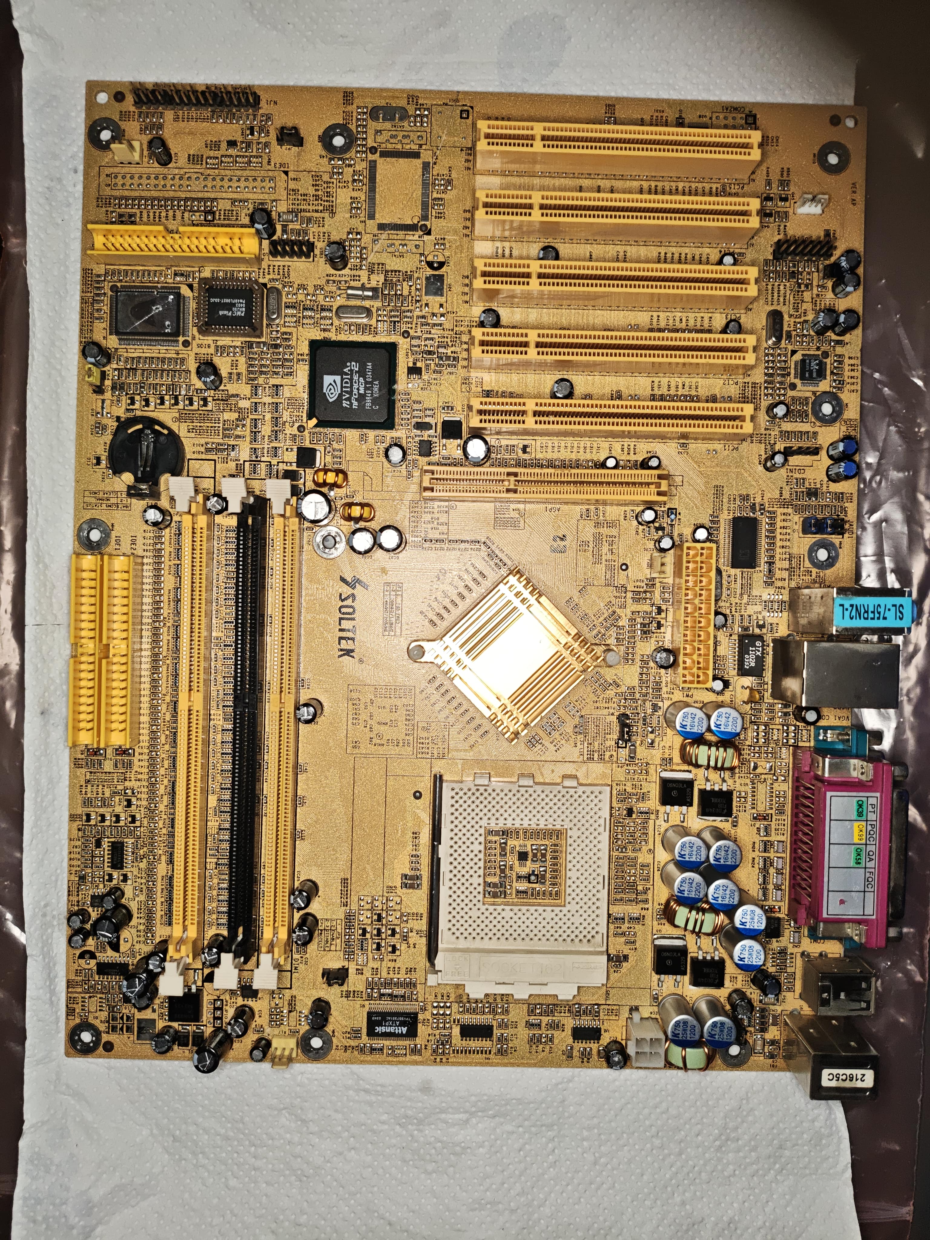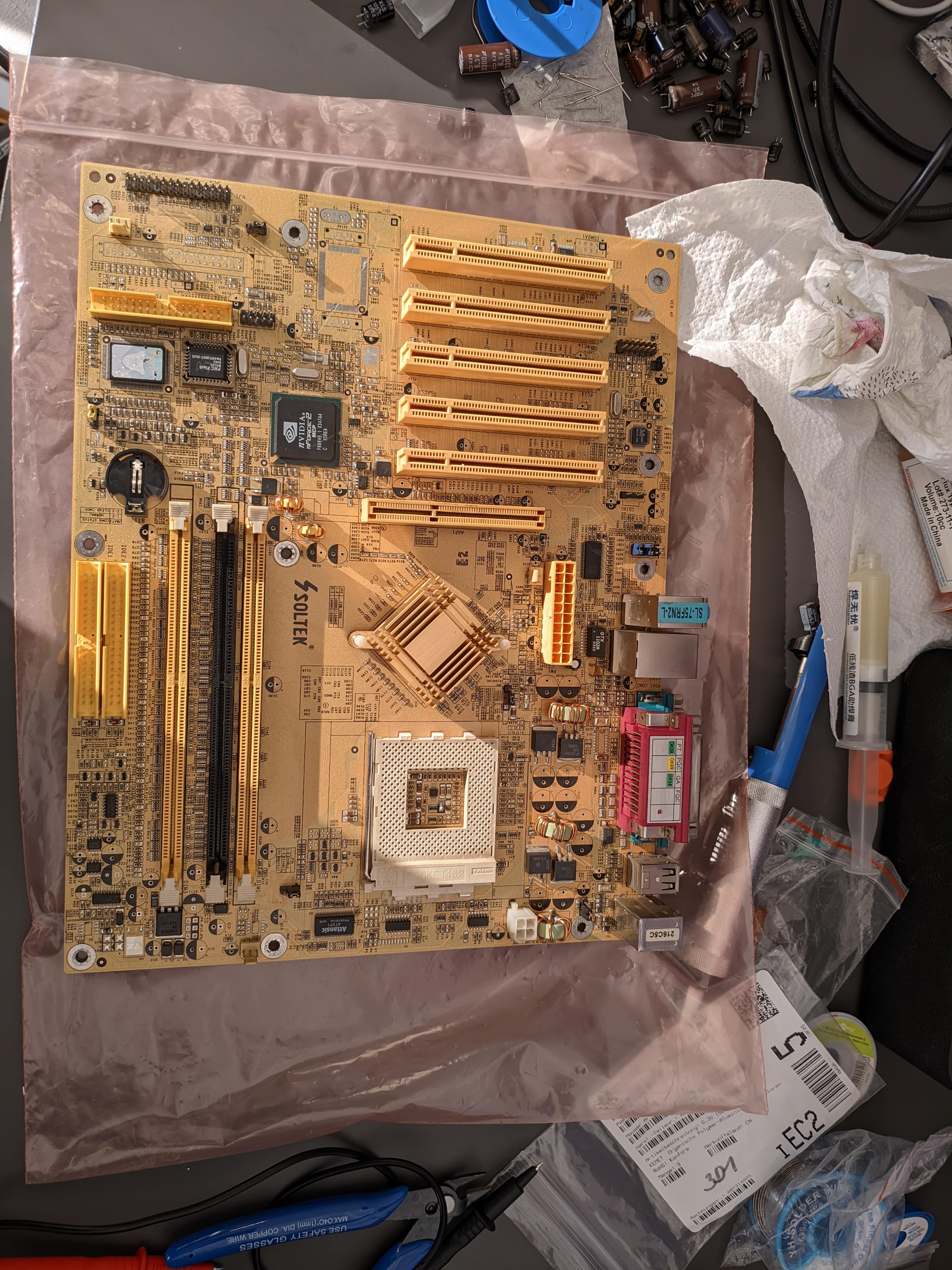 Hatte heute das Soltek von @lord86 auf dem Tisch. Es wurden alle Caps erneuert. Das Board läuft, trotz tiefem Kratzer auf der Vorderseite.