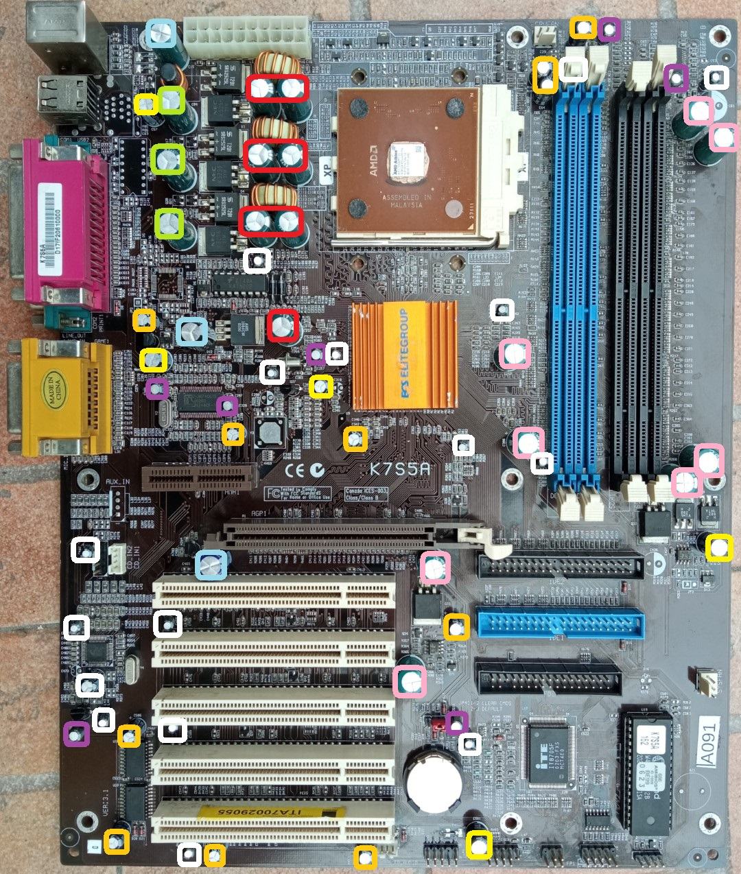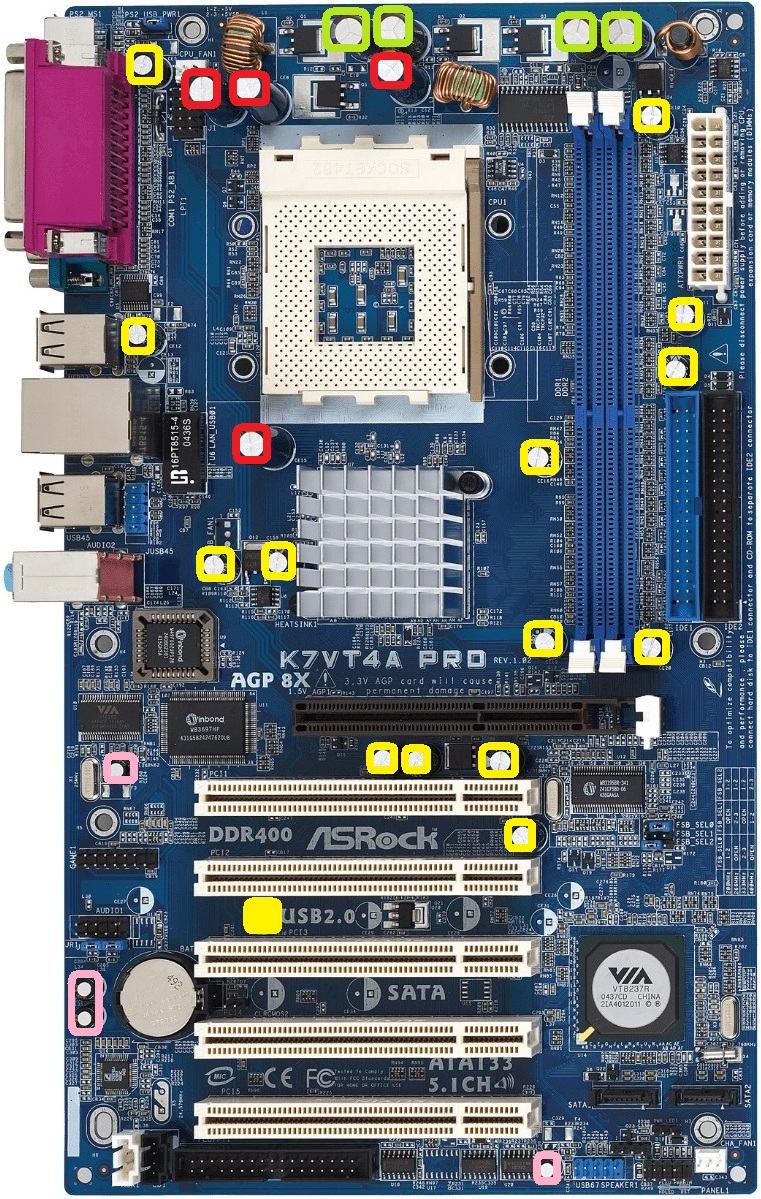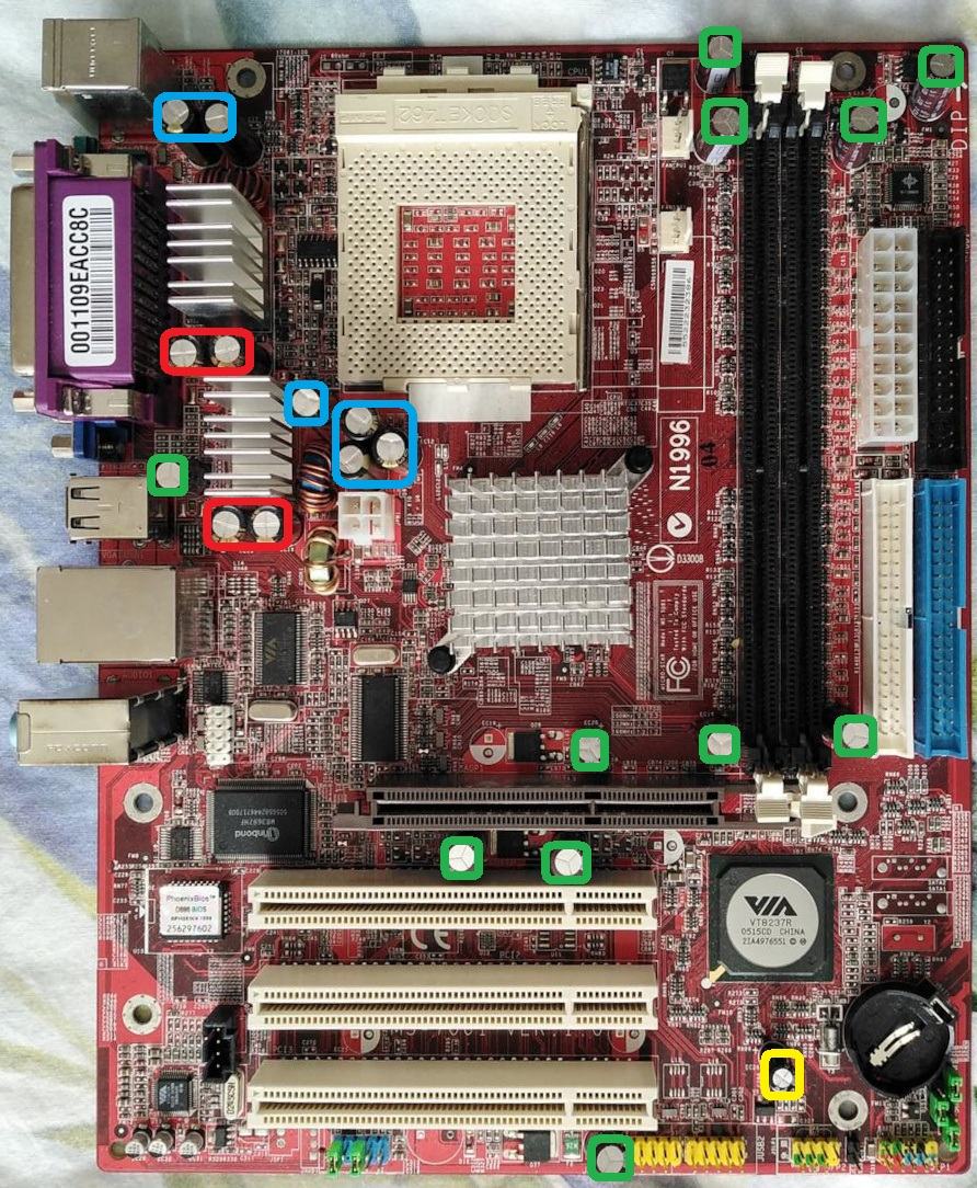 Achtung! Die FN4x-Reihe gibt es mit verschiedenen Chipsätzen und in unterschiedlichen Platinen-Revisionen. FN41 sollten jene nForce2 mit iGPU sein, FN45 als "normaler" nForce2. Je nach Chipsatz und Revision können sich andere Standorte der Caps ergeben!