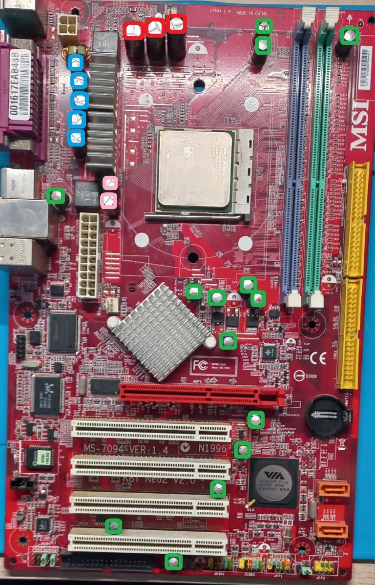 | rot | 3 | Panasonic FJ 6,3v 3300uF | 10x25 | 12 | 2800 | Kemet A750MW228M1CAAE010 | 10 | 7000 |