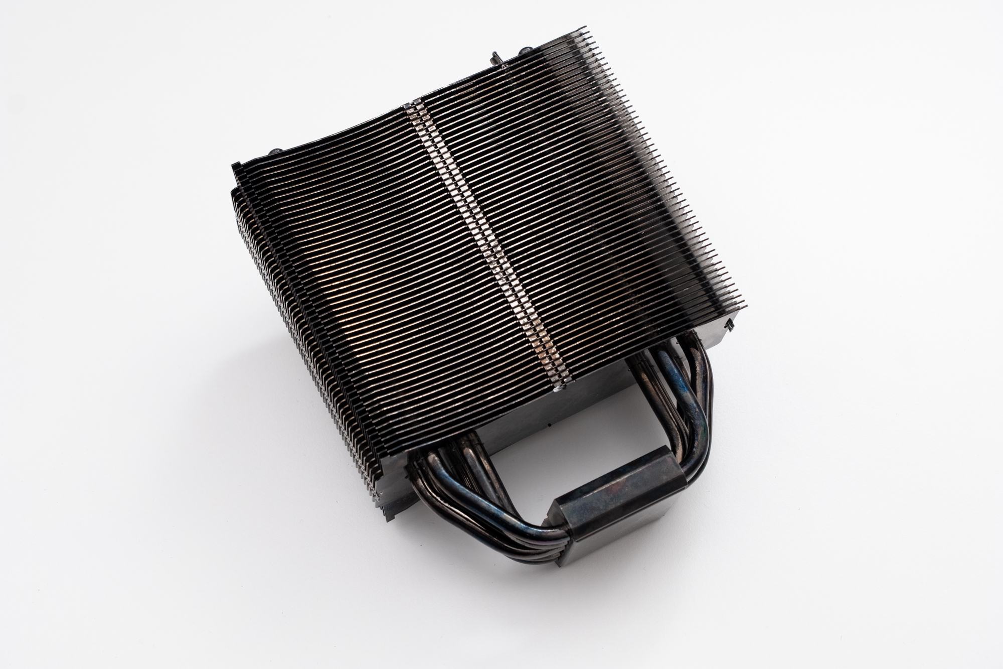 Den Kühler hatte ich letztes Jahr zur Kombination mit dem EVGA NF4 mATX und der 7800GTX KO ACS gekauft. Obwohl der Preis nicht grad niedrig war, kam das gute Stück natürlich zu schlecht verpackt an und hat offensichtlich einen Treffer kassiert, der Turm ist leicht gebogen und die äußeren Lamellen haben teils etwas Abrieb. Insgesamt ist er aber fit und kommt in der leider auch etwas gammeligen OVP. Ich hab nicht versucht, die Biegung zu richten.