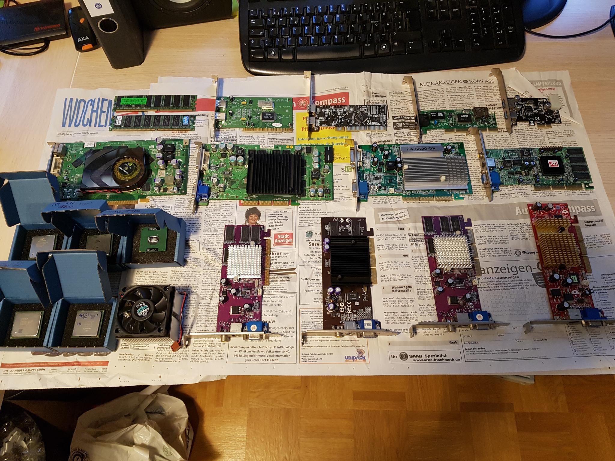 Ich löse meine Sammlung auf. Ich verschenke daher einen großen Karton mit folgender Hardware gegen Unkostenbeitrag von 10€ für Versand & Verpackung. Die Grafikkarten habe ich soweit alle nochmal getestet und sie funktionierten einwandfrei. Auch der Ram und die PCI Karten liefen einwandfrei. Lediglich zu den Sockel 478 CPUs kann ich keine Aussage treffen. Ich verschenke das Bundle nur komplett und es ist auch bereits schon gut verpackt.