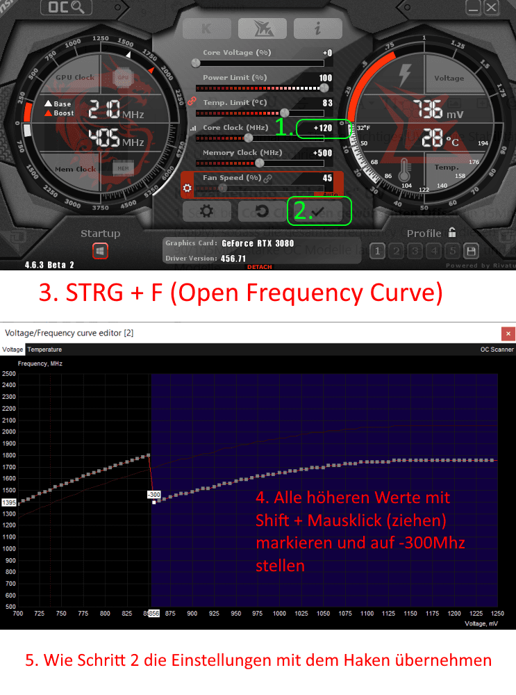 Eine detailierte Anleitung zu RTX3000 Untervolting gibts hier (da hab ich mir alle Infos geklaut und für Euch übersetzt):