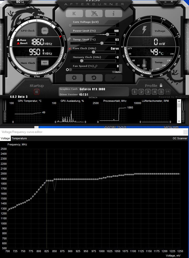 8) Wenn ihr ein stabiles Ergebnis habt: Einstellungen in Afterburner speichern und Afterburner in den Autostart. Dann die Einstellungen in Afterburner locken.