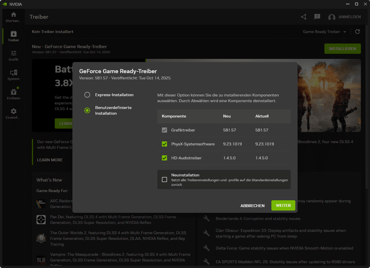 ich habe gerade meine RTX 5070 ti eingebaut und hab die Nvidia Treiber installiert. Die Karte wird in der HW Konfig erkannt und sieht erst mal gut aus. Wenn ich dann allerdings die Nvidia App öffne, sagt er mir keine Treiber installiert. Er schlägt mir auch die neusten vor. Wenn ich diese dann einfach nochmal installiert, passiert allerdings nichts. Bzw. er sagt immer noch das keine Treiber installiert sind... Wenn ich bei der Installation auf Benutzerdefiniert gehe, kann ich ja sehen, was alles installiert ist. Hier sagt er allerdings das alles passt und auch die neue Version drauf ist.
