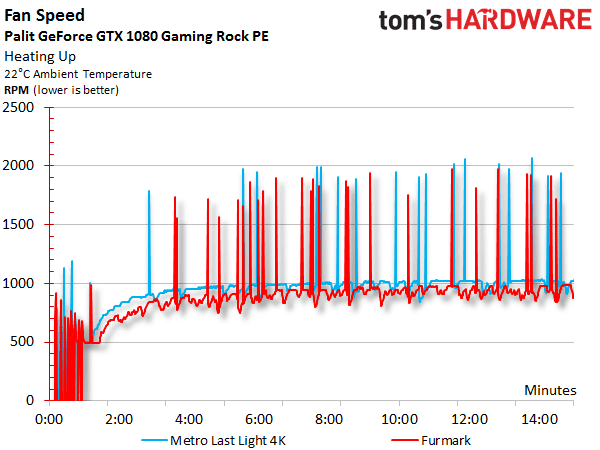 Die GeForce GTX 1070 erreicht im Leerlauf mit 0,4 Sone genau den selben Wert der 1080. Der Radiallüfter dreht mit ~1.100 RPM bei 27% PWM-Stärke. Unter Last schwankt die Lautheit zwischen 2,5 Sone (~50%) bis zu (max) 2,9 Sone (53% PWM @~2.120 RPM), was deutlich weniger als bei der GTX 1080 ist. Die Maximale Drehzahl des Radiallüfter beträgt @100% 4.000 RPM.