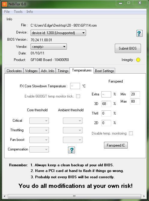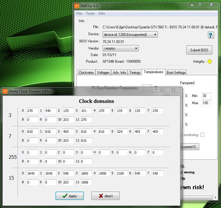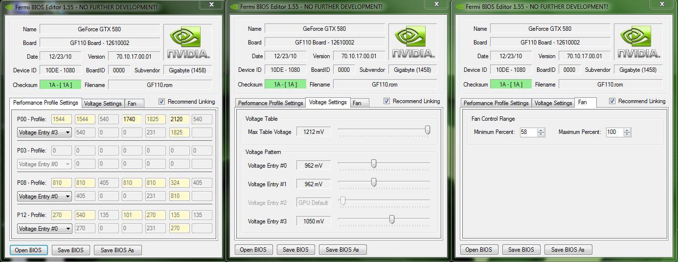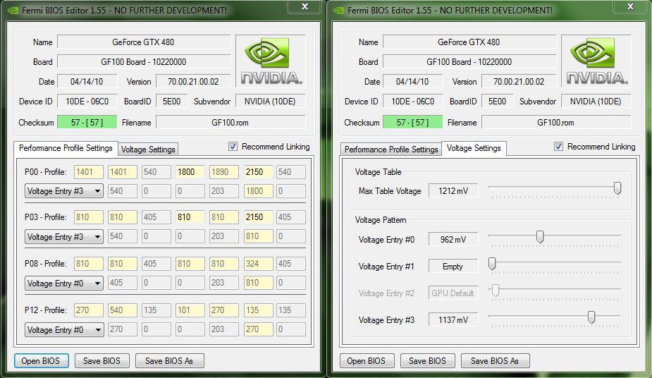 By the way: As a further development of the Fermi BIOS Editor was cancelled due to leaking, it is now freeware (the last update was released a couple of days before christmas 2010 and includes GTX 570 support (without 70.10.2x BIOS-Versions -> for that you have to use NiBiTor by setting the "unsupported device" to GTX 570 and do a "Rescan" at "Adv. Info". After editing the file set it to "unsupported device" again and save. Here it is shown for editing a GeForce GTX 560 Ti BIOS via NiBiTor 6.0 -> http://www.abload.de/browseGallery.php?gal=m2orrdvL&img=05mzu.png).