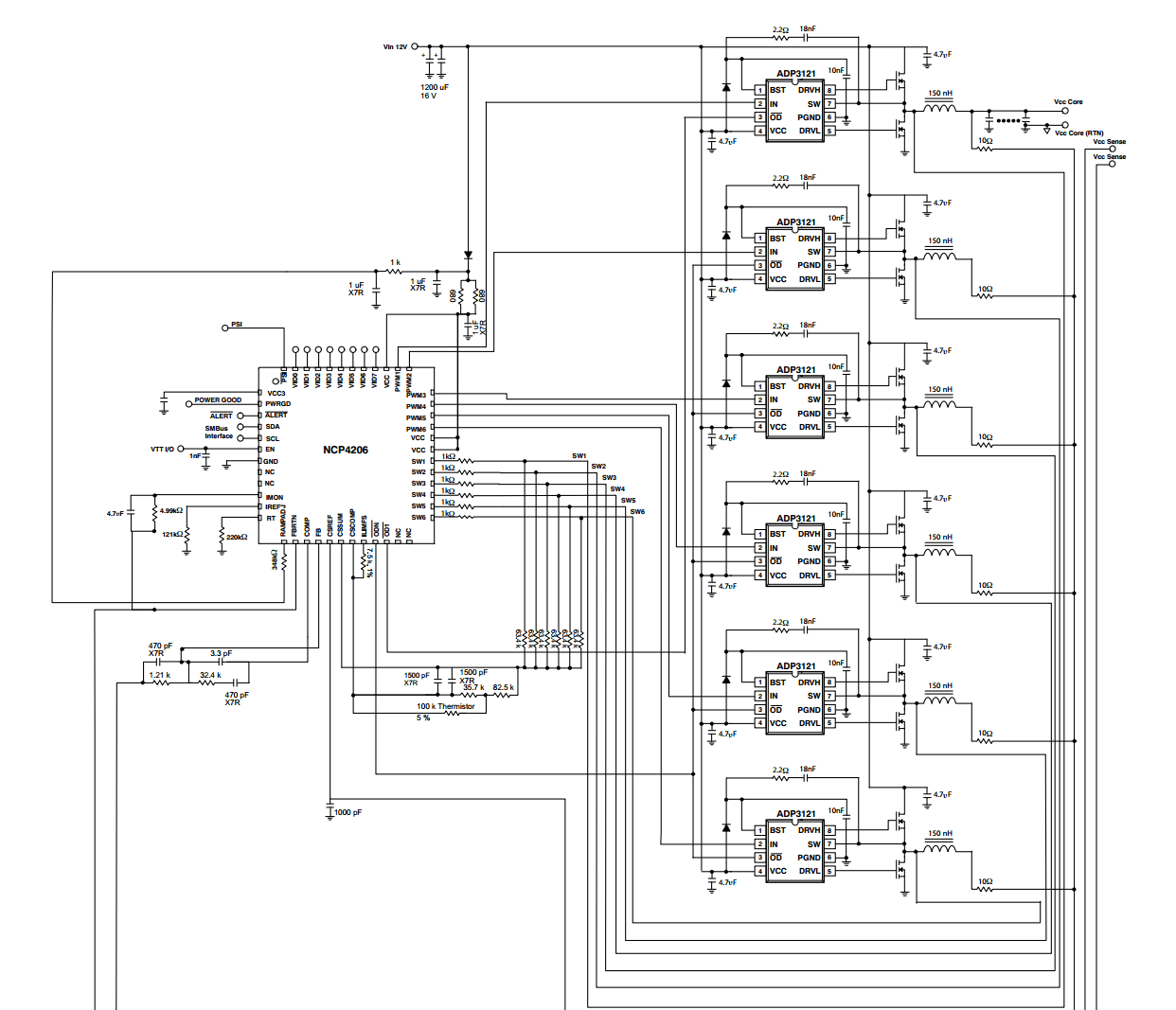 Wie man auch auf der Zeichnung erkennen kann VCC vom "Ncp4206" geht an die VCC von "ADP3121".