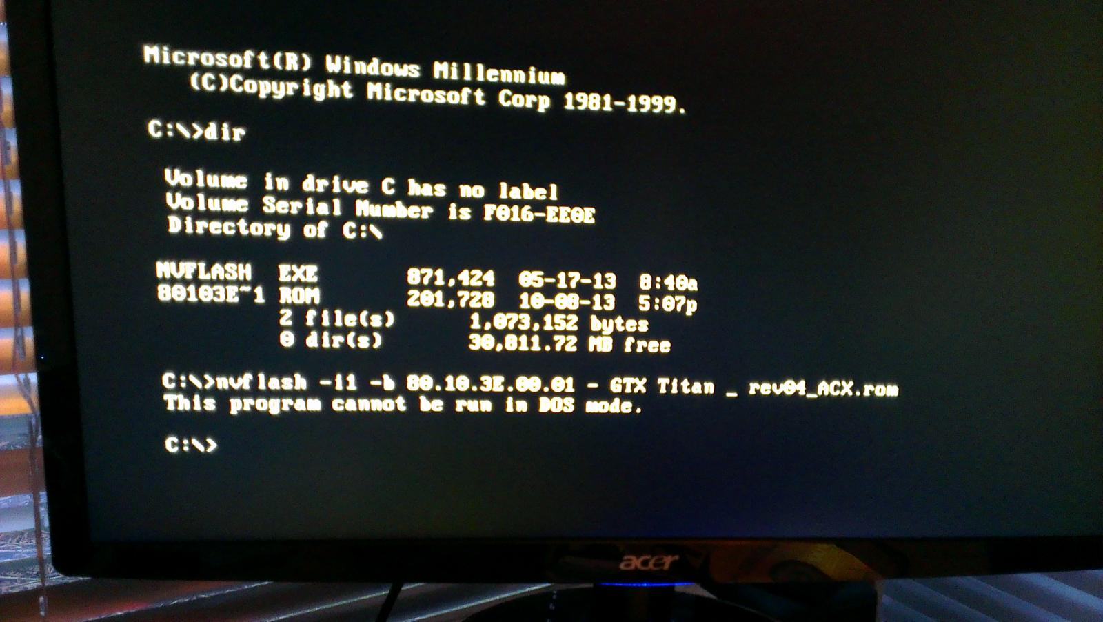 Hi also ich komm irgendwie nicht weiter. Kann ich die Titan die nun nach der GT210 steckt auch per Win nvflash flashen? Wenn ich NVflash so ausführe kann ich ja nix eingeben. Wenn ich nen Dos Stick erstelle dann kommt sowas raus :fresse2: ich steh auf kriegsfuß mit den Boot Sticks.