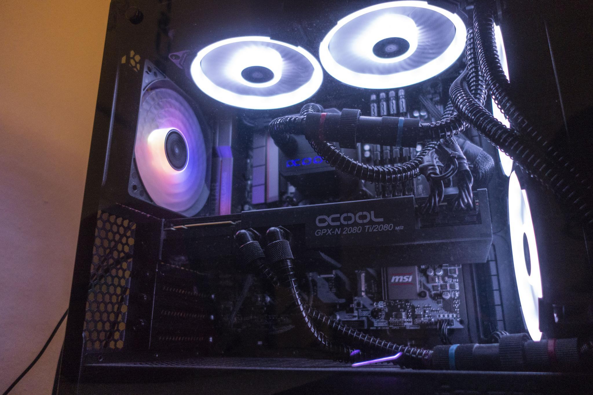 Die Lüfter auf dem Radiator sind jeweils 2x Corsair 120LL RGB. Beide WAKÜs laufen auf extrem LOWRPM, Desktop = 3D Lautstärke. Die 2080 taktet sich selbstständig auf knapp über 2GHz hoch.