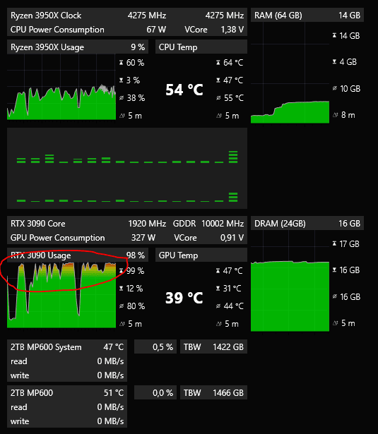 Kurze Info wegen Stromverbrauch: 3090 Trio auf Anschlag + 9900K mit 1,36v und 5,4 GHZ = 665W für das gesamte System bei mir (SH). Dies kann natürlich bei euch abweichen. Eine Strix kann 100W mehr ziehen. Daher würde ich jedem, der OC betreibt +850W Netzteile empfehlen
