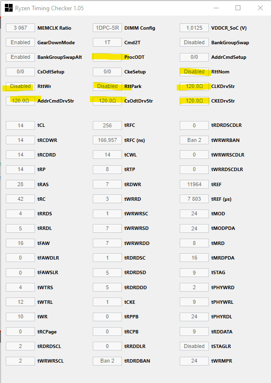 procODT und RTT Werte sowie die CADBUS Werte sind angepasst - Ryzen Timing Checker zeigt hier aber einen komplett anderen Wert.