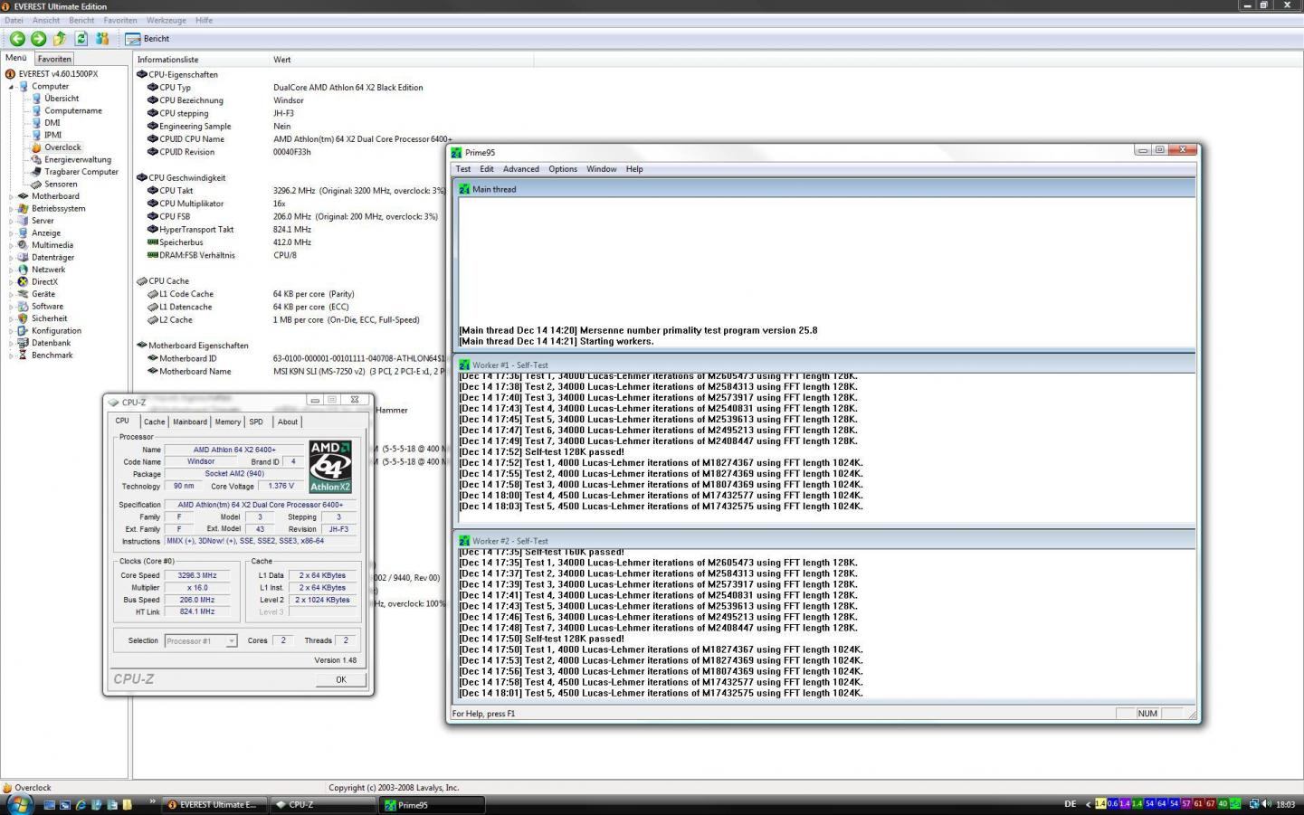 Ich habe die CPU jetzt von standardmäßig 3,2 GHz auf 3,296 GHz (206 MHz FSB). Prime95 lief 4 Stunden lang, d.h. einen kompletten Durchlauf von 1024K bis 128K Lucas-Lehmer, Option In-Large-FFT. Spannung habe ich im BIOS jetzt 1,425V eingestellt. Komischerweise überschreitet er laut CPU-Z aber fast nie 1,4V!? Ohne die V-Core-Erhöhung bringt er aber Fehler. HT: 800 MHz (4x).