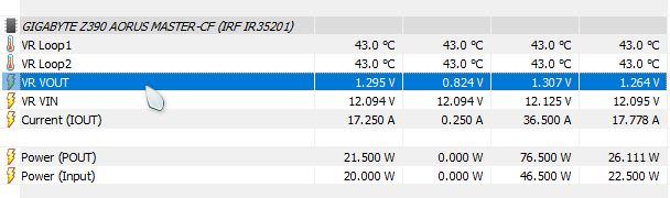 Noch eine Besonderheit bei Gigabyte Boards: Die VCore, die CPU-z (unter Last) anzeigt ist nicht sehr genau. Genauer ist der Wert VR VOUT der in HWINFO bei der Sensor Übersicht angezeigt wird (recht weit unten)