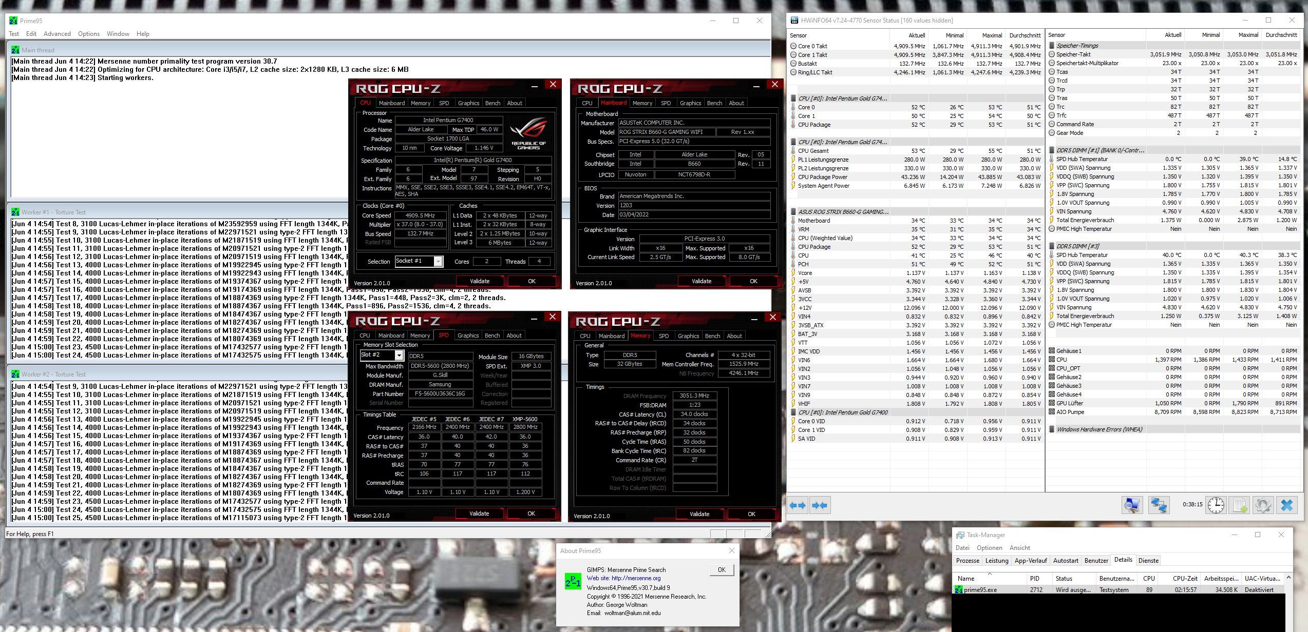 Um die Resultate zu messen und Einschätzen zu können habe ich mir überlegt, mit Cinebench R23 in Single- und Multicore zu benchen, ebenso 3D-Mark Time Spy und den CPU-Test, sowie Hyper-PI. Überwacht bzw. ausgelesen wird mit HWInfo.
