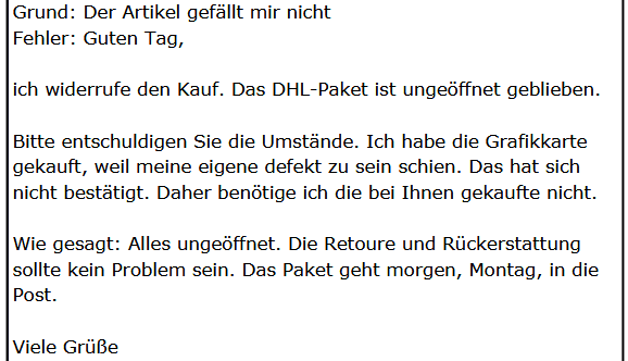 Da das aus vernünftiger kaufmännischer Sicht nicht für die Beendigung der Geschäftsbeziehung spricht, kann es nur die Rücksendung der Grafikkarte gewesen sein, die bei Mindfactory den Kündigungstrigger ausgelöst hat. Obwohl ich den Grund in meinem Widerruf (irrtümlich gedacht, meine alte Graka sei defekt) erläutert hatte.