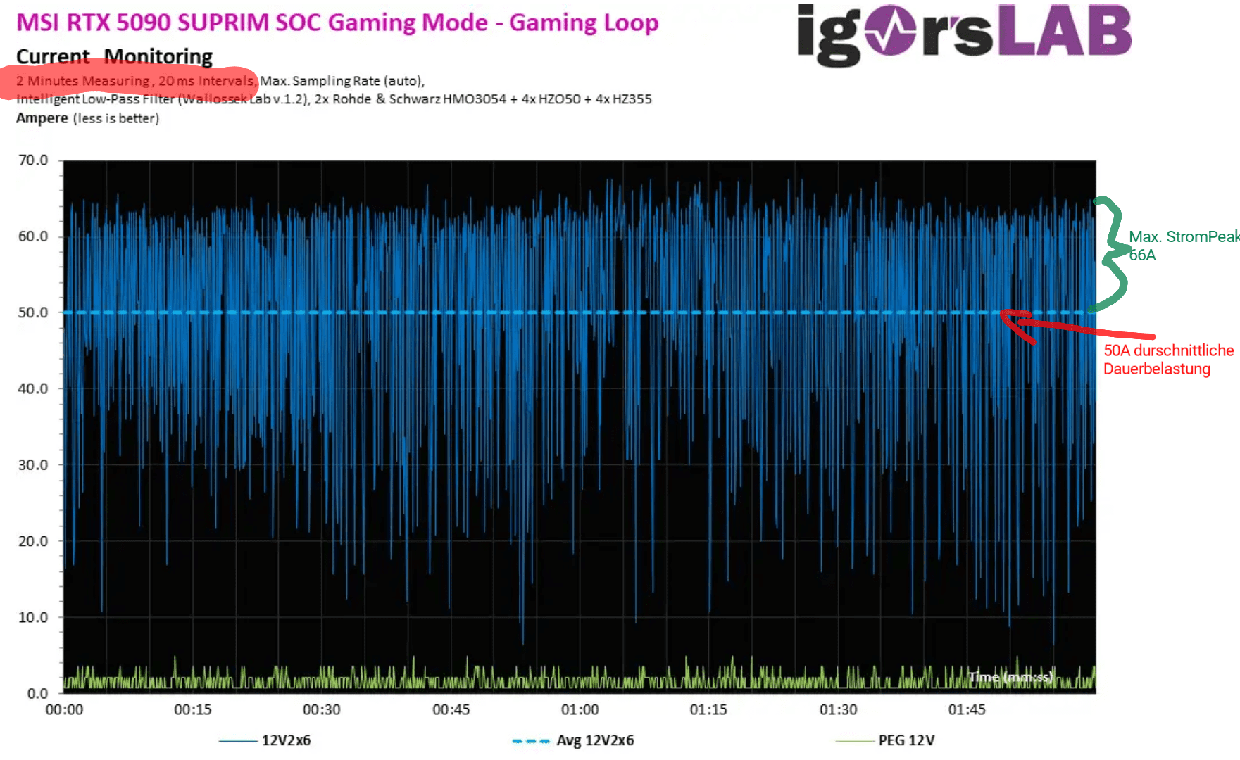 Schon mit StandardBios ohne ShuntMod(600W Powerlimit) liegen mindestens 50A durschnittliche DauerStromBelastung(2min, 20 MilliSekunden MessIntervalle) inkl. bis zu 71A PeakStromImulse(20 MikroSekunden MessIntervall)e an.Ich habe bei 100% Last noch nie gesehen, dass die 5090 unter 50A ballert, mit shunt mod liege ich in Regionen 65-70A dauerhaft und mit Peak von rund 100A