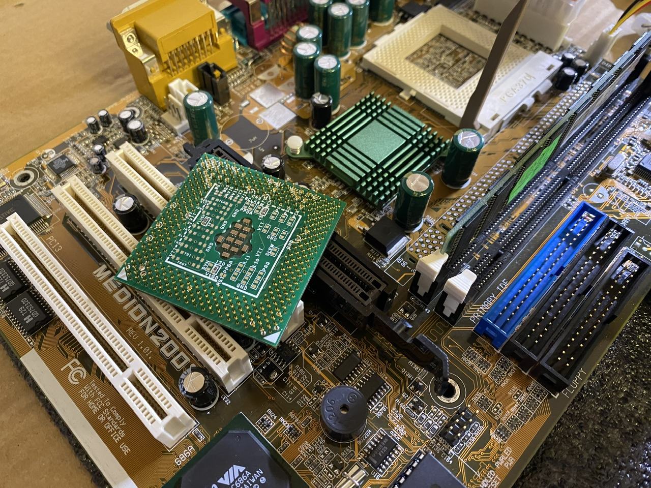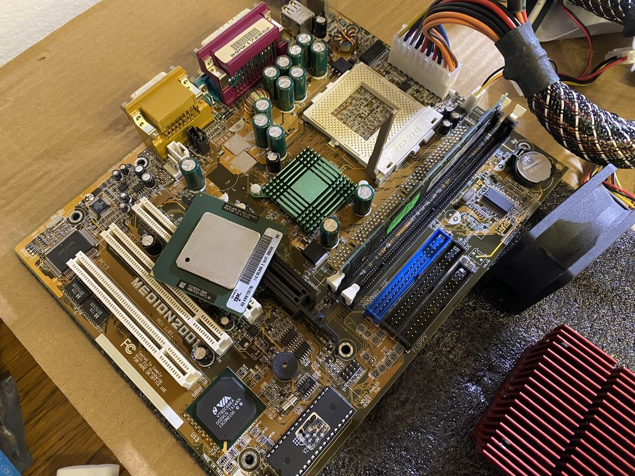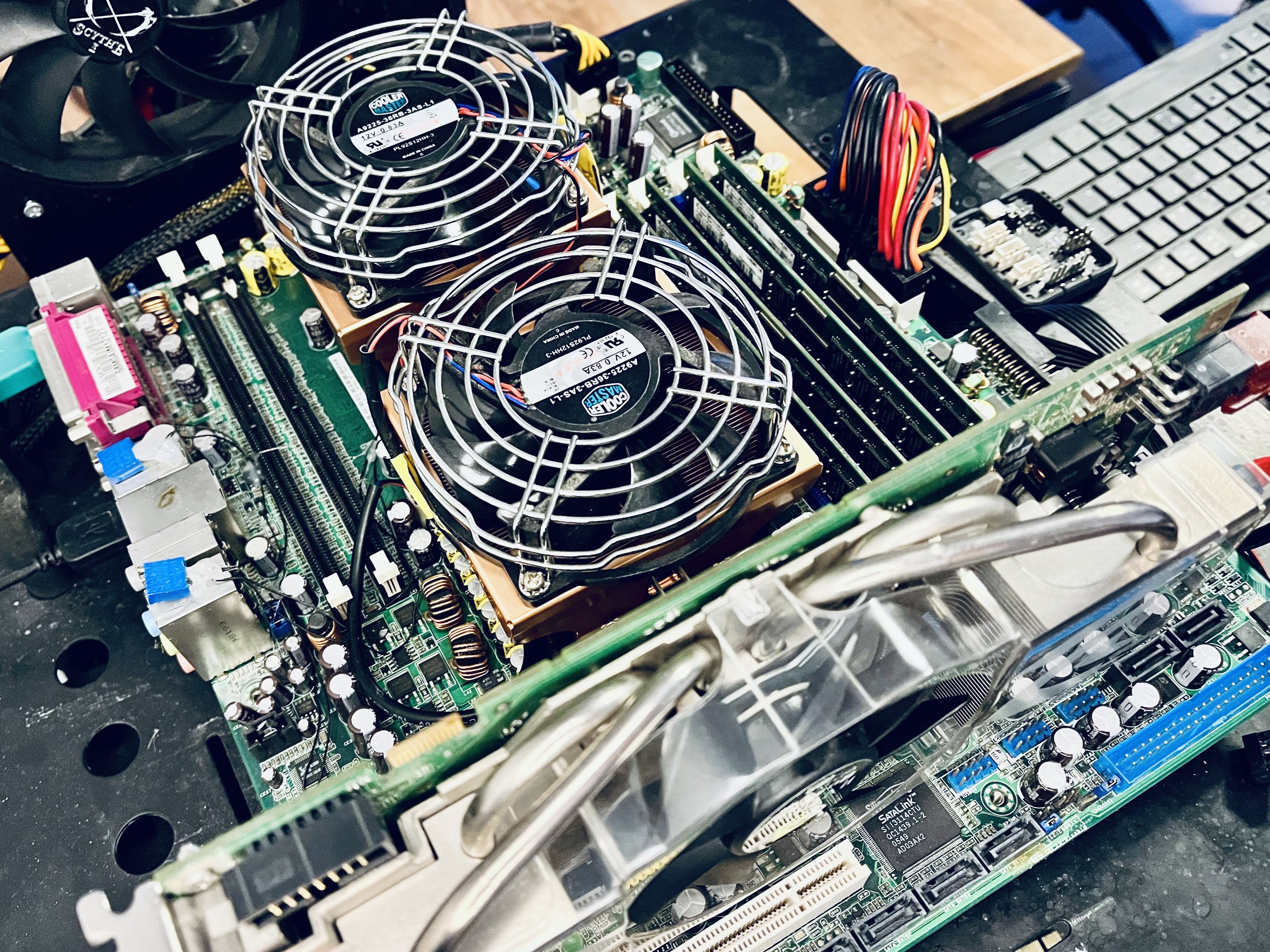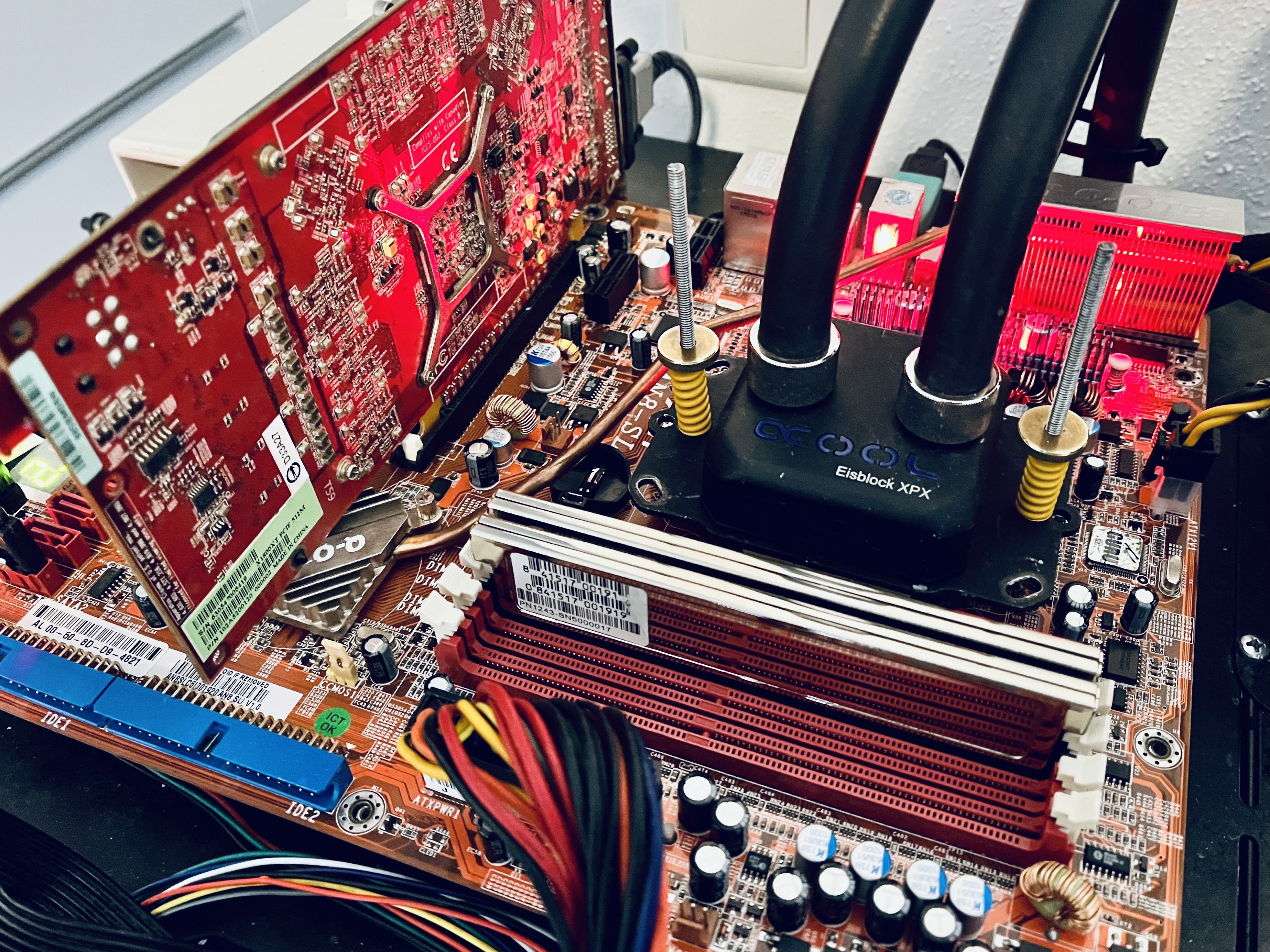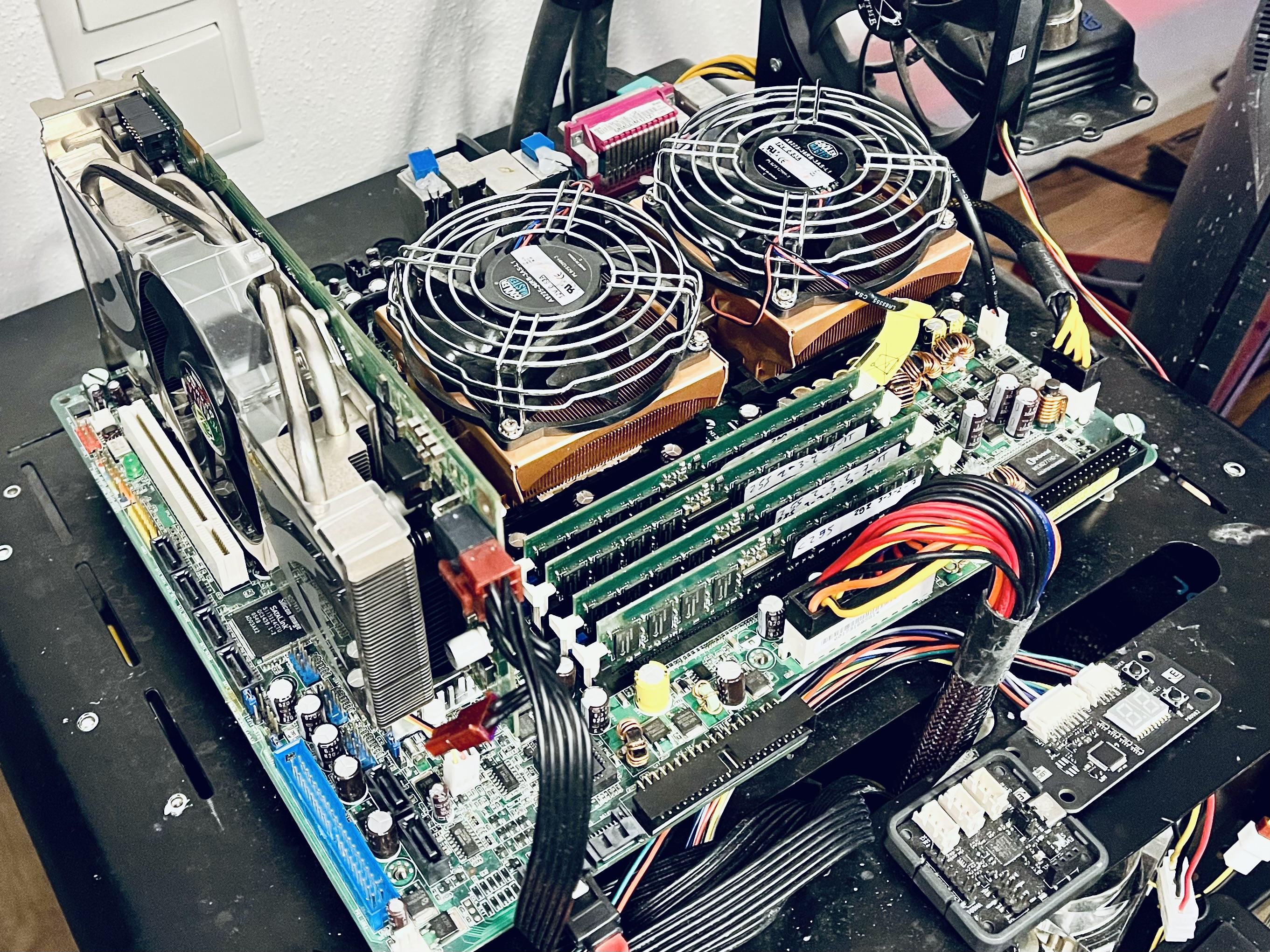 Was haste denn da für CPU Kühler drauf? Ich such da noch was in ordentliches für meins. Hab momentan so zwei Kupferblöcke da drauf die eher für Server gedacht sind. Problem ist bei meinen Lian-Li Gehäuse, dass der Kühler nicht über den Rand des Boards hinaus ragen darf.K8N-DL rausgeholt