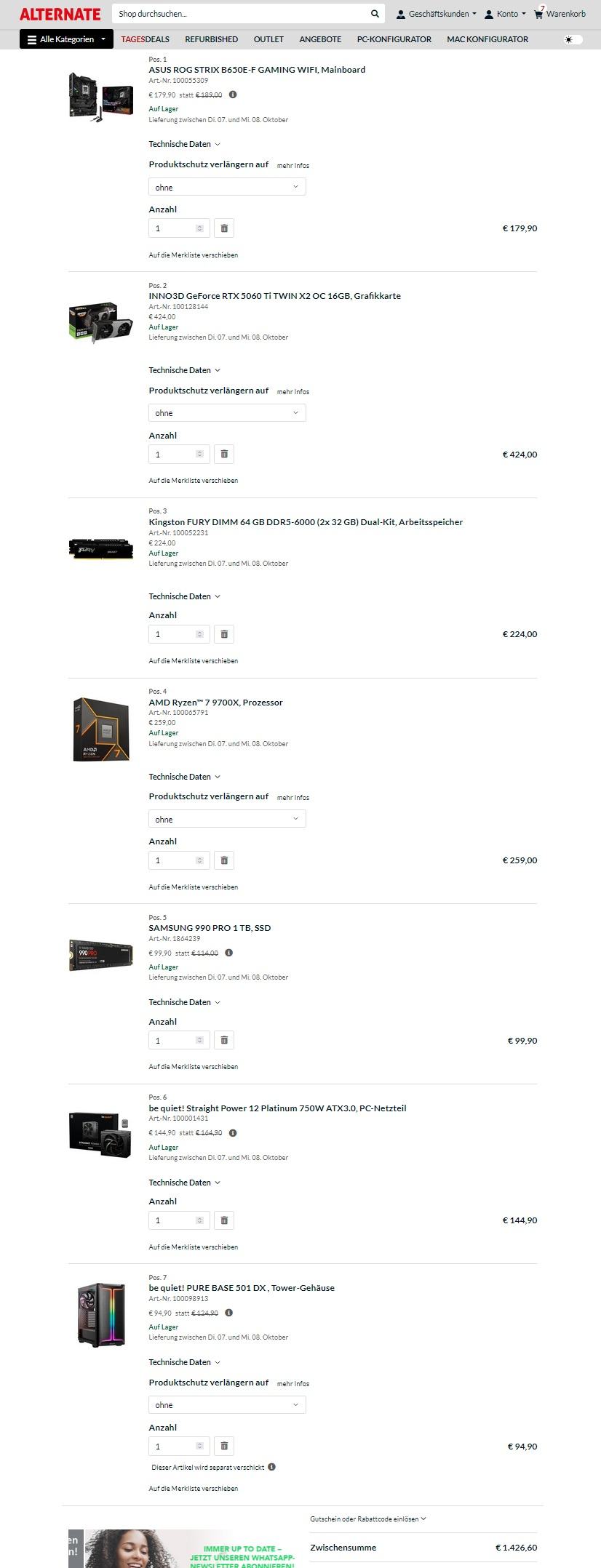 Alles Angebote bei Alternate, wo man "schnell" sein sollte! Knapp über 1400,-€, es fehlt nur noch der CPU Kühler.