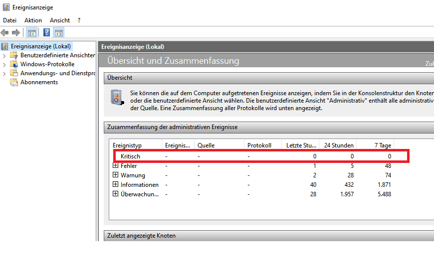 ansonsten noch auf die Ereignisanzeige schauen