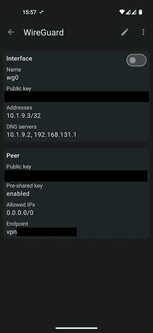 Das sollte so nicht sein. Kann mich aber daran erinnern, das Problem auch schon mal auf Windows gehabt zu haben, später aber nicht mehr... Auf Android läuft es auf jeden Fall auch nur mit dem WG-Server als DNS-Server. Gerade mal gegengeprüft indem ich WiFi deaktiviert habe und dann das Phone neugestartet habe, die WG Verbindung konnte dennoch aufgebaut werden.Meinte, wenn ich am iPhone (in der WireGuard-App) bei den Tunnel-Einstellungen als DNS-Server den WireGuard-Server (welcher ja auf OPNSense läuft) eintrage, dann bekomme ich keine Verbindung.