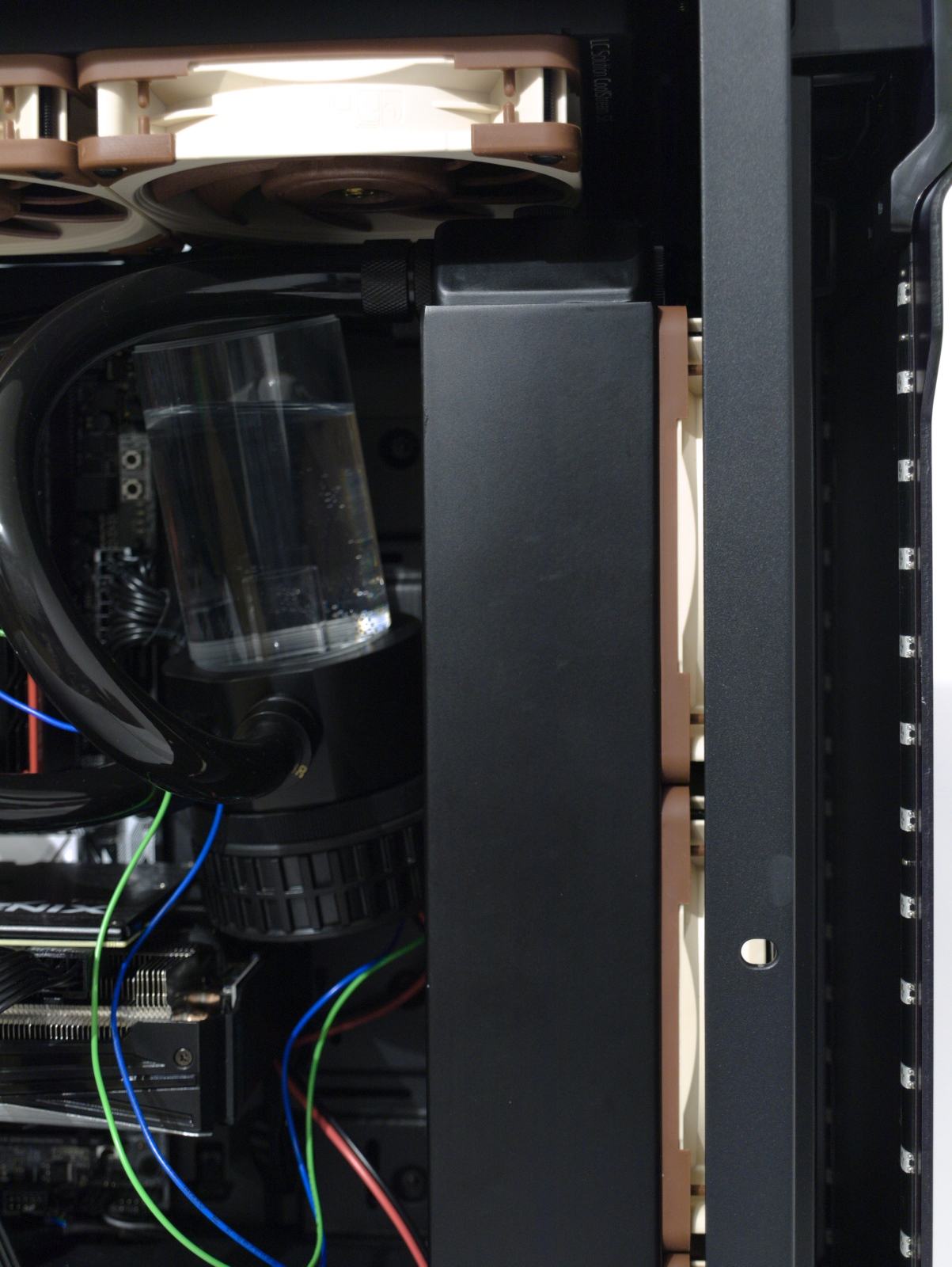 Diese Kabelabdeckungen an der Seite sind zwar eine nette Idee aber das Problem ist, dass selbige zu 100% zu/eingerastet sein müssen damit das Seitenteil zu geht. Mit entsprechend viel Kabeln ist das gar nicht so einfach. Alternativ kann man die Abdeckungen zwar einfach komplett abnehmen dann hat man aber durch die Glasrückseite und die nur bedingt schließenden Abdeckungen zur Hauptkammer hin durchscheinendes Licht bzw kann durchs Gehäuse durchschauen.