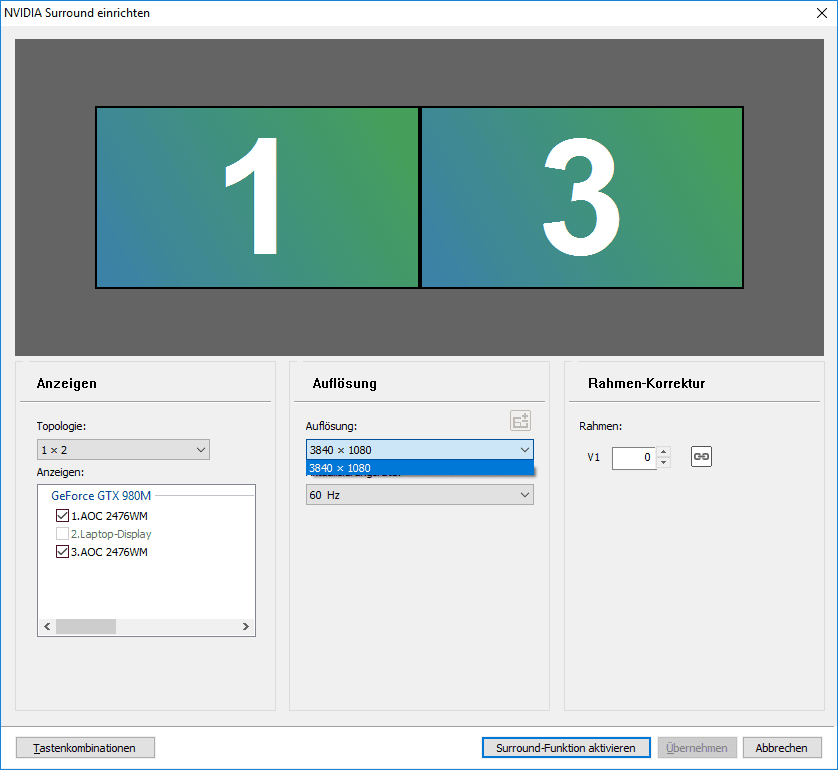 die monitore lauf .. links fernsehn, mitte spielen, rechts browser und so .. nur krieg ich das mit dem surround nicht hin .. würde gerne mal bissl was damit spielen .. ich geh auf die einstellungen und will surround einschalten .. aber irgendwie nimmt der da den monitor vom laptop weg .. die anderen 2 könnten könnt ich schön im surround betreiben .. treiber sind gestern alle aktualisiert .. woran könnte das noch liegen? ich hab videos gesehen wo ein 20 und ein 24 zoll im surround gespielt worden sind .. dh es dürfte ja nicht stören das die monitore die noch dran hängen ..