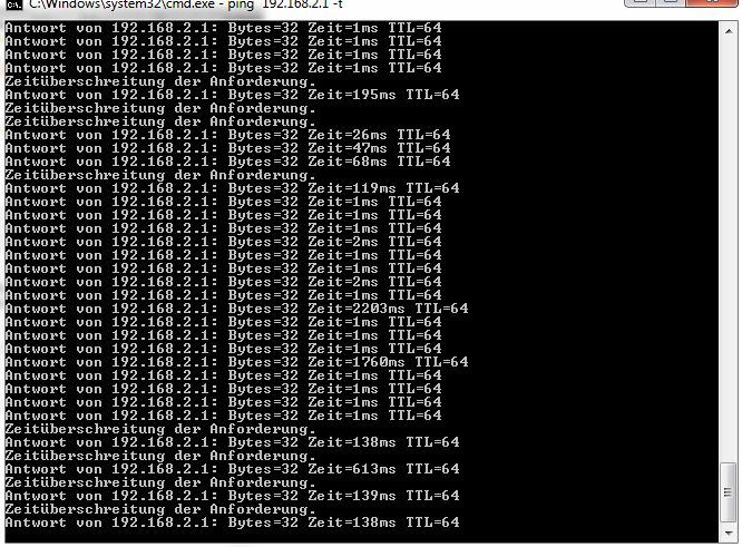 Ein dauerhafter Ping auf mein Standardgateway ergibt ein seltsames Bild. Sobald auch nur minimale Last anliegt bricht die Verbindung anscheinend zusammen. Datentransferraten von 3kb sind bei eine VDSL50 Leitung schon bitter.