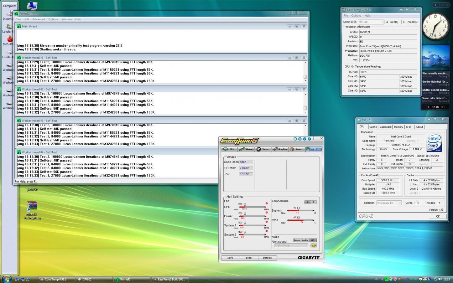 Habe mir vor kurzem einen Q9650 und ein P45 extreme geholt, läuft auch alles super. Nur wie ihr anhand des Screenshot sehen könnt tritt unter Last eine Tempdifferenz von ca. 10 grad auf. Gekühlt wird die cpu mit einen Mugen 2 und AS5 paste.