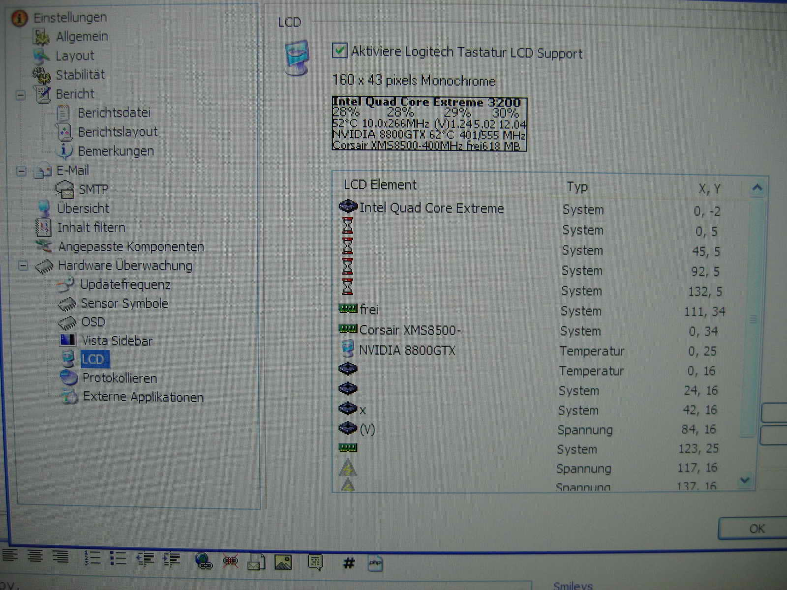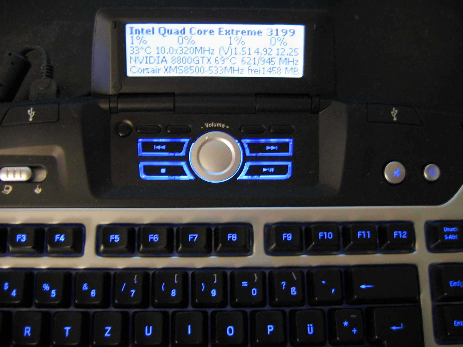 Ja habe das G 15 gekauft und mit dem neuen Everest kann man das LCD nahezu frei per Menü programmieren mit den Auslesewerten vom Everest. Bei Everest einfach einstellen : Mit Windows starten und schon hat man alles Infos auf dem Display der Tastatur---------