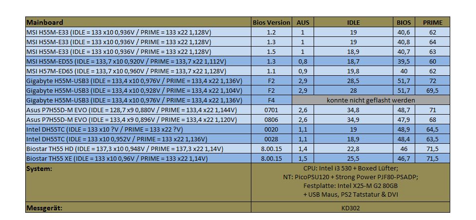 Häufig wird das H55 Board von Intel (H55TC), welches selbst die Extremsparer H55 Boards von MSI@Default unterbietet