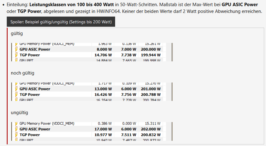 • Einteilung: Leistungsklassen von 100 bis 350 Watt in 50-Watt-Schritten. Maßstab ist der Max-Wert bei GPU ASIC Power und TGP Power, abgelesen und gezeigt in HWiNFO64. Keiner der beiden Werte darf 2 Watt positive Abweichung erreichen.