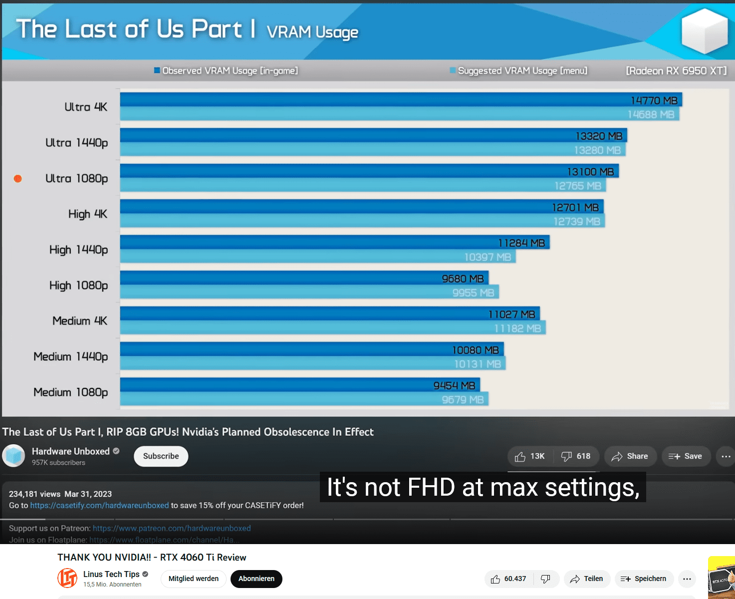 Klar ist aber auch aus meiner Sicht, die technisch tollen Karten RTX 4070/Ti und RTX 4060Ti werden durch den Geiz an Speicher zu einer Schäbigkeit. Da erkennt man praktisch den Charakter dieser Firma. Solche Charaktere würde ich immer verurteilen.