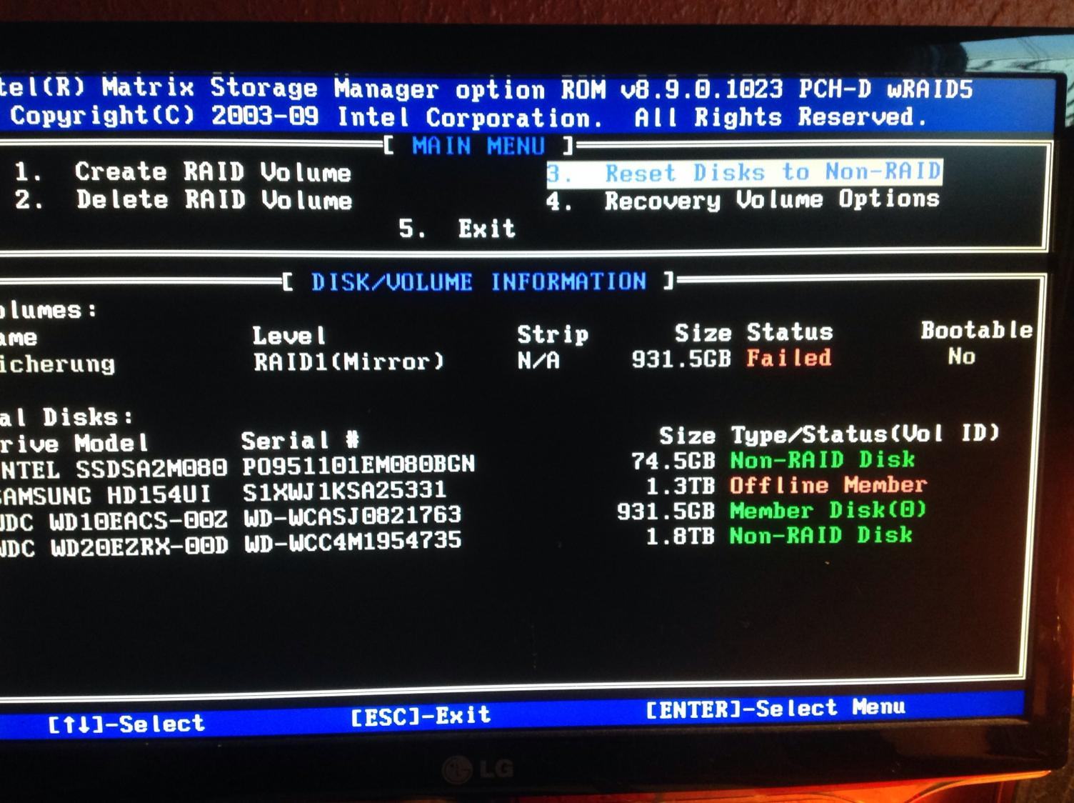 Wenn ich in das entsprechende Raid Bios Menü gehe, kommt direkt die Frage "failed raid volume detected, recover volume"