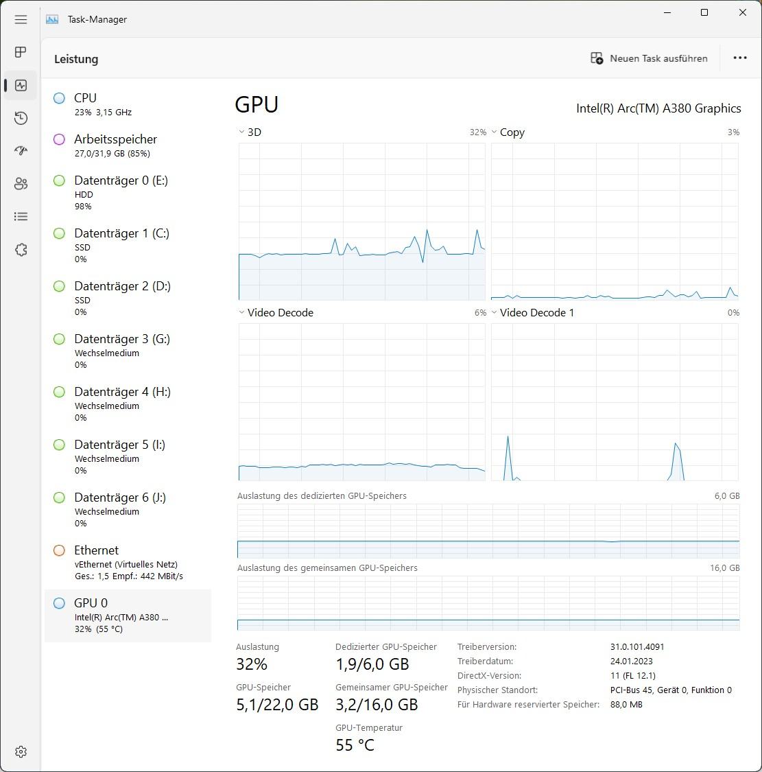 Hardware ist ein AMD 5800x und eine Intel Arc A380 Grafikkarte.