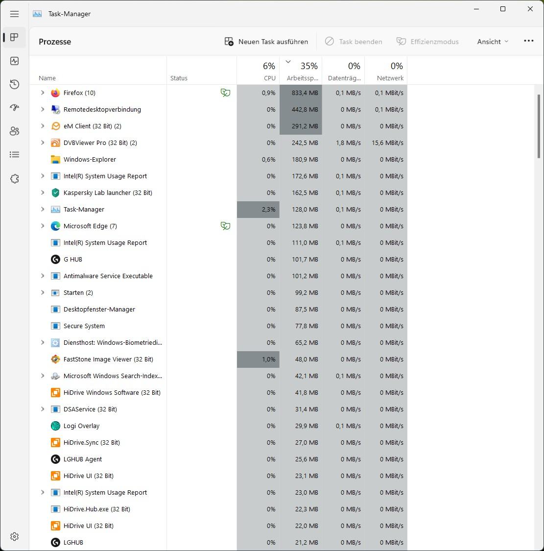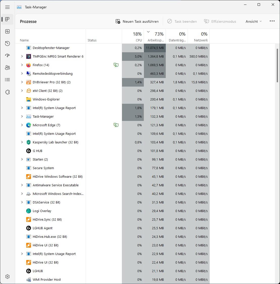Auffällig ist, daß vor allem während des Videoschnittes oft der "Desktopfenster-Manager" an der Spitze auftaucht, weil er sich bis zu 4 GB genehmigt. Dahinter Firefox mit vielen Tabs und 1,4 GB und dann das Schnittprogramm (TmpgEnc Smart Renderer) mit 500 MB. Es sind aber 32 GB installiert, so daß hier kein Mangel sein sollte.