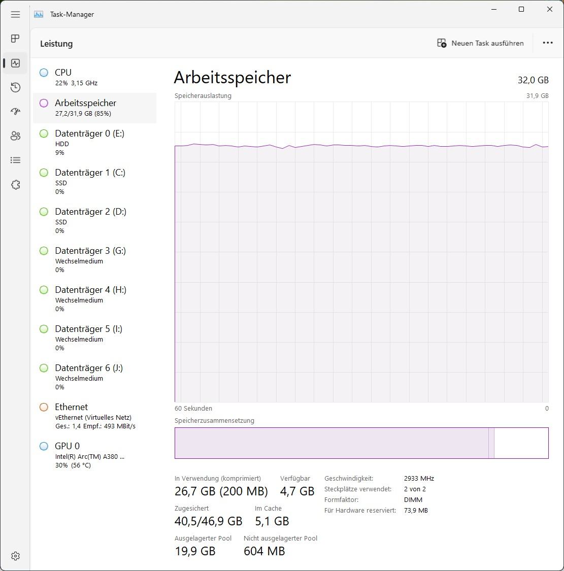 Schon! Mich stört halt nur, daß ich nicht sehen kann, wohin der ganze RAM verschwindet. Denn selbst wenn sich der Desktopfenster-Manager 11 GB genehmigt, sind ja immer noch über die Hälfte eigentlich frei. Dennoch kommt der PC dann schon ins Stottern und im Taskmanager werden bis zu 94% Auslastung in Summe angezeigt.
