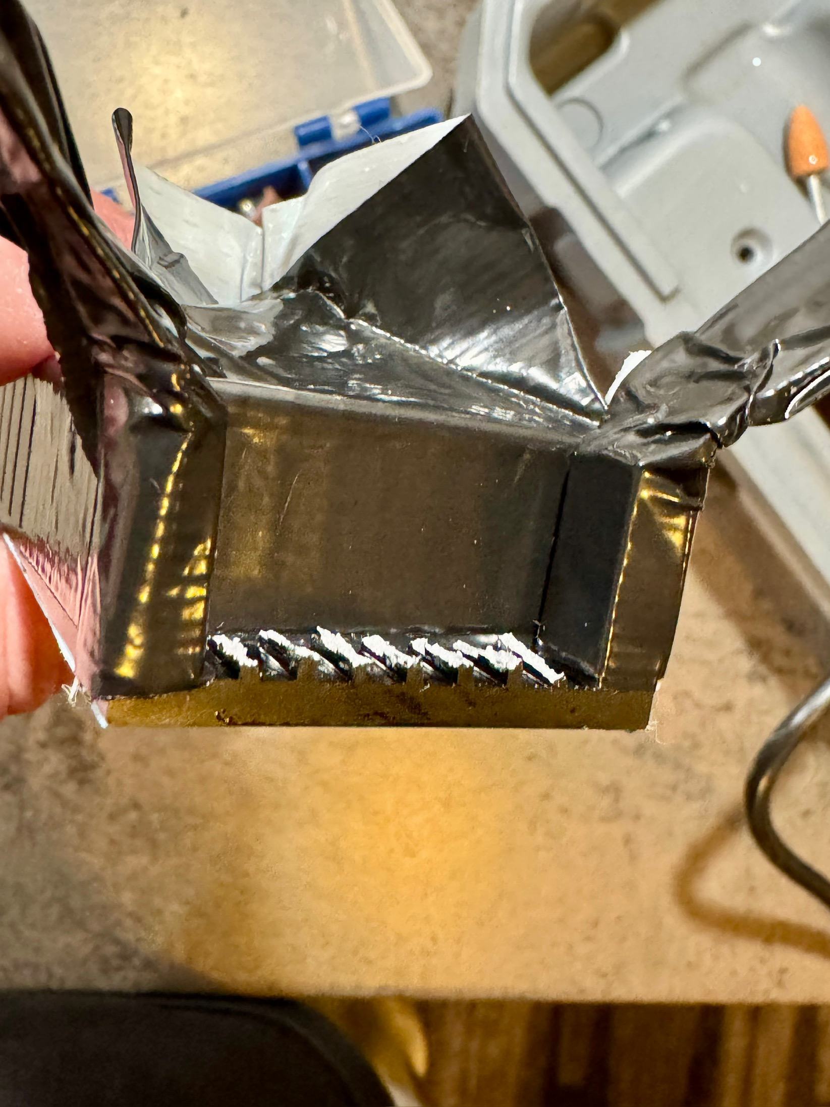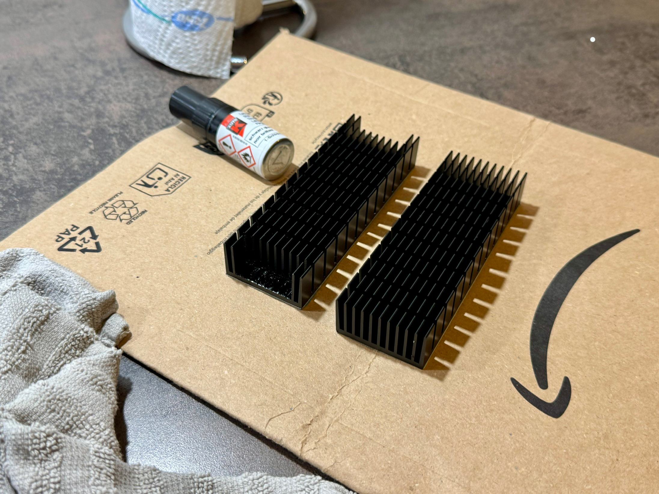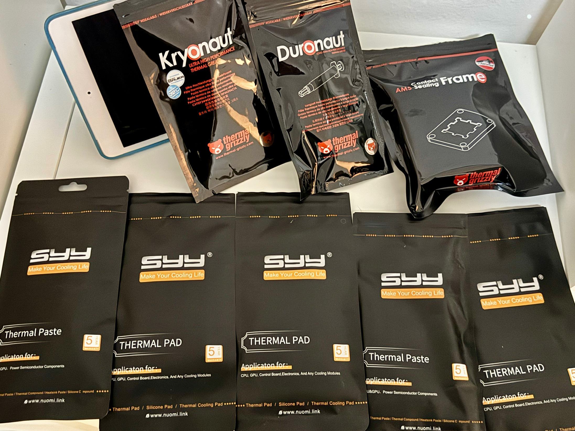 Als Wärmeleiter habe ich Putty, genauer gesagt CX-H1300 (13,5 W/mK), genommen und dieses vorher mit Arctic MX-6 vermischt, damit's ein wenig weicher ist. Vielleicht performt es damit auch ein wenig besser, wer weiß. Beim Auftragen auf IC's und PMIC kann man ruhig großzügig sein. Der Überschuss drückt sich sowieso raus, den man dann ganz einfach entfernen kann. Ich mach das immer mit'm dünnen Plastiktool. Einmal die Kante lang gehen und fertig. Rest wieder zusammenkneten und wegpacken.