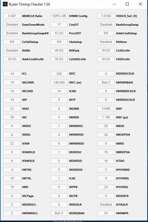 Dein tRFC Wert ist sehr hoch! Den solltest du langsam reduzieren und testen. Mit 3466 würde ich hier etwas zwischen 360-420 erwarten (ohne Garantie). Die anderen Subtimings könnte man auch noch etwas straffer fahren. Ich würde hier einfach mal die "safe" und "fast" Settings des Ryzen RAM Calculators ran ziehen und zwischen diesen ausloten.